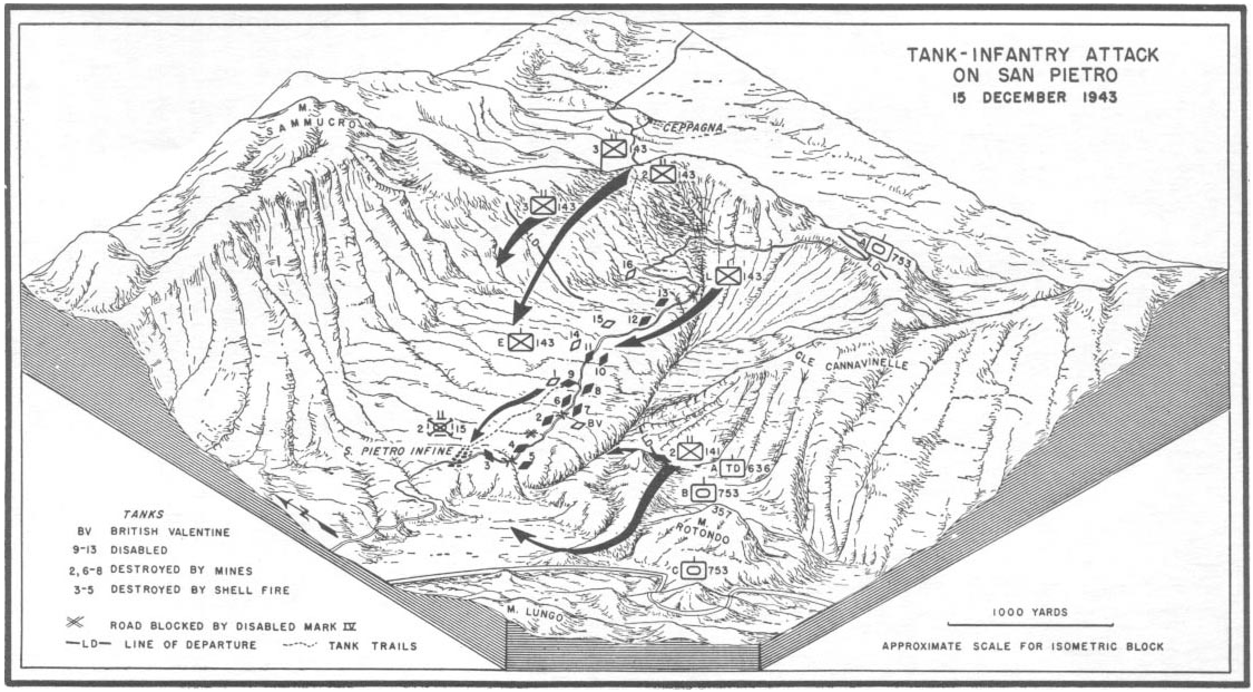 Since the 7th of December, the American 36th (Texas) Division had been attempting to remove the German strongpoint of San Pietro. The “T-Patchers” and their supporting elements had made two previous attempts against San Pietro, but they had no success in the face of tough resistance. The Germans, in terrain well-suited to the defense, were able to bring down a murderous fire on any attempt to break into the town. After noon on December 15th, the 143rd Infantry Regiment, with the support of Company A of the 753rd Tank Battalion, renewed the attack. After crossing what had been christened “Death Valley”, the Texans rushed across the ceppagna road, and approached the southern edge of the village.Attacker: American (2nd Battalion, 141st Infantry Regiment and A Company, 753rd Tank Battalion)