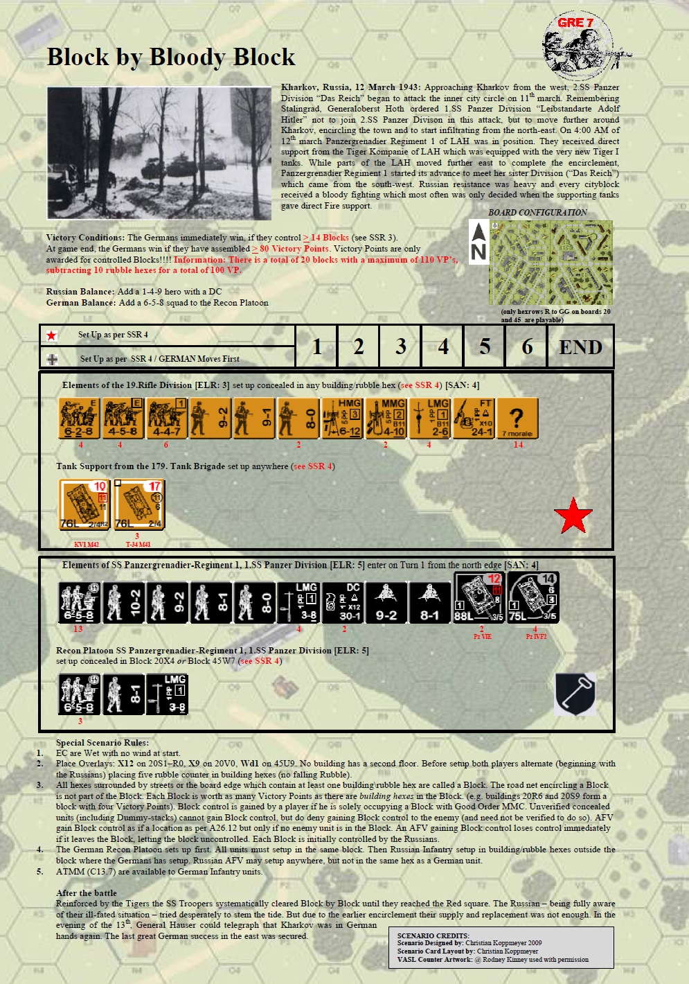 Approaching Kharkov from the west, 2.SS Panzer Division “Das Reich” began to attack the inner city circle on 11th March. Remembering Stalingrad, Generaloberst Hoth ordered 1.SS Panzer Division “Leibstandarte Adolf Hitler” not to join 2.SS Panzer Divison in this attack, but to move further around Kharkov, encircling the town and to start infiltrating from the north-east. On 4:00 AM of 12th March, Panzergrenadier Regiment 1 of LAH was in position. They received direct support from the Tiger Kompanie of LAH which was equipped with the very new Tiger I tanks. While parts of the LAH moved further east to complete the encirclement, Panzergrenadier Regiment 1 started its advance to meet her sister Division (“Das Reich”) which came from the south-west. Russian resistance was heavy and every city block received bloody fighting which most often was only decided when the supporting tanks gave direct fire support.Attacker: German (SS) (SS Panzergrenadier-Regiment 1, 1.SS Panzer Division "Leibstandarte Adolf Hitler")