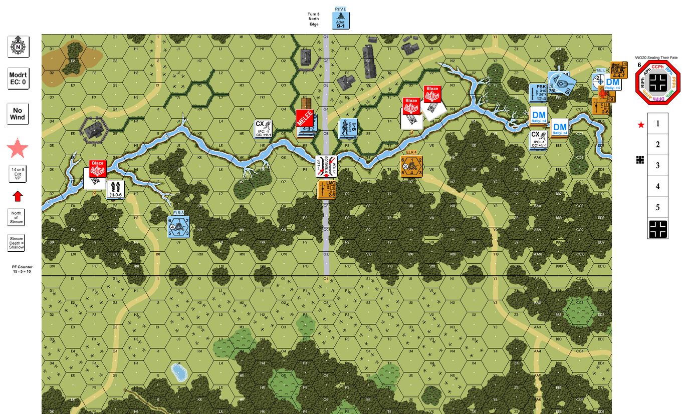 | 2024-02-11 | (A) Vic Lauterbach | vs | JM | German (SS) win | This small, late-war scenario was fun and close. It's a great use of variable defender OB. I attacked both flanks to spread out Jim's small force, but my main objective was getting infantry into the 72Z2-DD3 woods. One SU-76 fell to a PF and the other two were burned by the arriving PzIV. I got 9 exit VP across with 4 more in the stream, but PzIV fire and a PSK shot broke all but one (and one in melee). Note that the VC EXC prevents the slease tactic of abandoning SU-76s in the stream and advancing the crews out on the last turn! Jim: I like the tricky trade off given the defender. I took the PzIV and 9-1 armor leader figuring its firepower and mobility could neutralize the SU-76s and then hammer Vic's main crossing force. That worked, but just a few missed shots would have cost me the win. |
