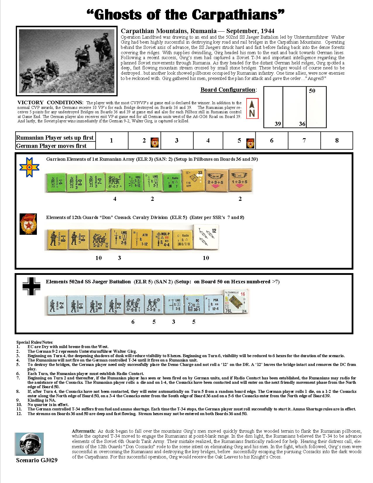 Operation Landfried was drawing to an end and the 502nd SS Jäger Battalion led by Untersturmführer Walter Girg had been highly successful in destroying key road and rail bridges in the Carpathian Mountains. Operating behind the Soviet axis of advance, the SS Jägers struck hard and fast before fading back into the dense forests covering the ridges. With supplies dwindling, Girg headed his men to the east and back towards German lines. Following a recent success, Girg’s men had captured a Soviet T-34 and important intelligence regarding the planned Soviet movements through Romania. As they headed for the distant German-held ridges, Girg spotted a deep, fast flowing mountain stream crossed by small stone bridges. These bridges would of course need to be destroyed...but another look showed pillboxes occupied by Romanian infantry. One time allies, were now enemies to be reckoned with. Girg gathered his men, presented the plan for attack and gave the order…”Angreif!”Attacker: German (SS) (502nd SS Jaeger Battalion)