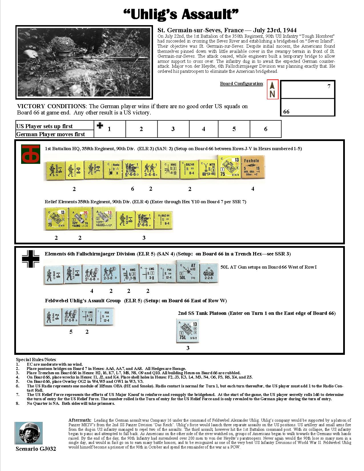 On July 22nd, the 1st Battalion of the 358th Regiment, 90th US Infantry “Tough Hombres” had succeeded in crossing the Sèves River and established a bridgehead on “Sèves Island”. Their objective was St. Germain-sur-Sèves. Despite initial success, the Americans found themselves pinned down with little available cover in the swampy terrain in front of St. Germain-sur-Sèves. The attack ceased, while engineers built a temporary bridge to allow armor support to cross over. The infantry dug in to await the expected German counter-attack. Major von der Heydte, 6th Fallschirmjäger Division was planning exactly that. He ordered his paratroopers to eliminate the American bridgehead. Leading the German assault was Company 16 under the command of Feldwebel Alexander Uhlig. Uhlig’s company would be supported by a platoon of Panzer Mk IV’s from the 2nd SS Panzer Division ‘Das Reich’.Attacker: German (6th Fallschirmjaeger Division and 2nd SS Tank Platoon)