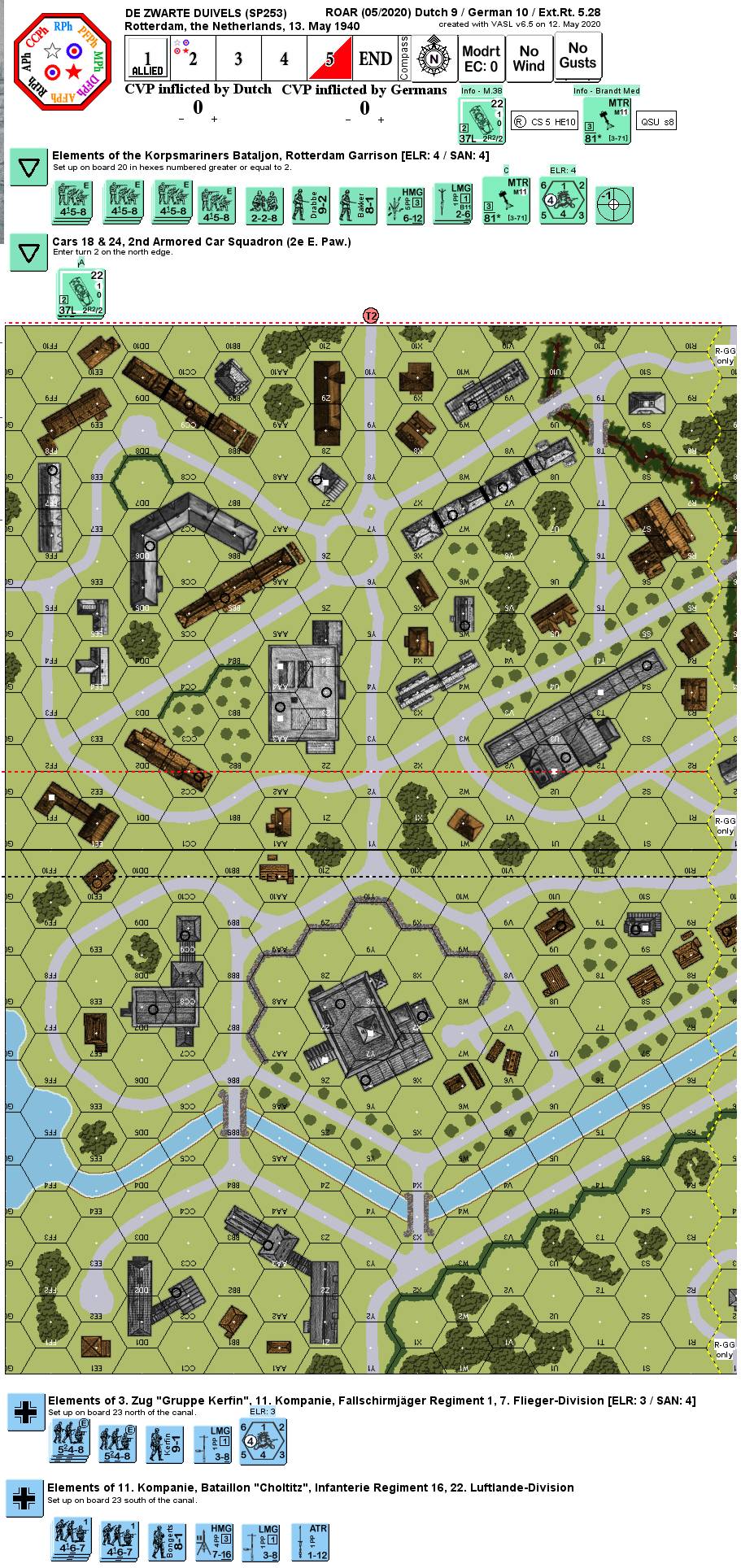 On the 12th of May, the commander of Dutch troops in Rotterdam, Colonel Scharoo, was ordered to clear the Germans from the north shore and to destroy the Nieuwe Maas River bridge. Scharoo in turn directed the commander of the Rotterdam Marine Garrison to complete the tasks. Two batteries of 105mm howitzers and two armored cars, along with six 81mm mortars were to support the attack.Attacker: Dutch (Korpsmariners Bataljon, Rotterdam Garrison and cars 18 & 24, 2nd Armored Car Squadron (2e E. Paw.))