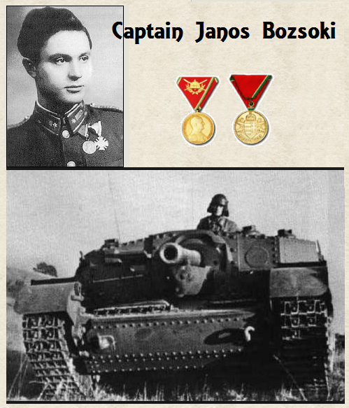 The Soviet 9th Guards Mechanized Corps broke through to the Tordai Gorge and proceeded to surround the Hungarian 25th Reconnaissance Battalion. This breakthrough put the Soviet tanks at Szind, only four kilometers from the doorstep of Torda. The Hungarian 11th Infantry Battalion and the 10/2 Assault Artillery Battery counterattacked, surprising the tank crews of the Soviet 46th Guards Tank brigade in the process. Captain Janos Bozsoki, leading his six Zrinyi II assault guns, knocked out approximately eighteen Soviet tanks during the day’s fighting, preventing the encirclement of Torda. Later in the day Bozoki returned to the front line to rescue seriously wounded comrades and recover damaged assault howitzers. He was awarded the Officers’ Gold Medal for Bravery.Attacker: Hungarian (25th Reconnaissance Battalion, Hungarian 25th Infantry Division)