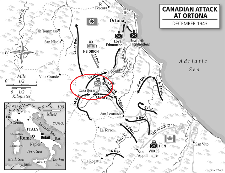 The Vandoos were tasked with advancing up the Orsonga-Ortona Road and capture the "CIDER" crossroads. The Vandoo's C Company, under the command of Captain Paul Triquet led his men towards the crossroad, when they came under heavy mortar and machine-gun fire. Unable to move, the Vandoos were raked merciless by the unrelenting fire and soon casualties began to mount.Attacker: Canadian (C Company, Royal 22é Regiment (Vandoos), 3rd Infantry Brigade)