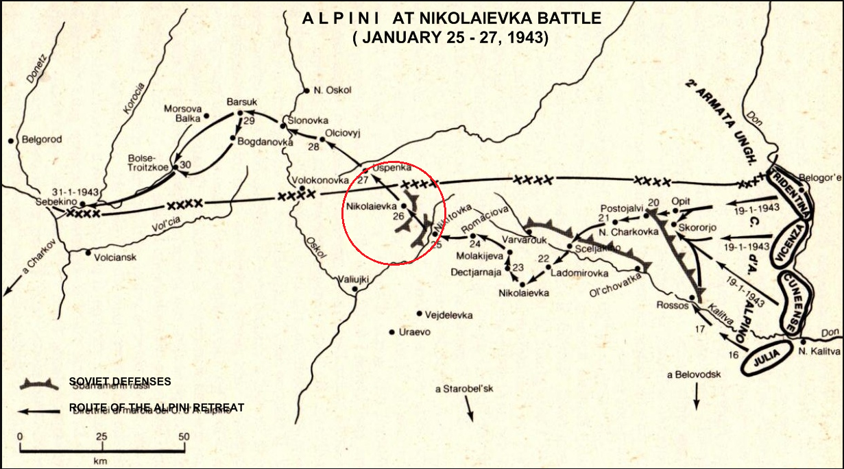 Scenario and VASL map available for free on Lone Canuck website . . .On 13 January 1943, the Red Army launched the second stage of Operation Saturn. Four armies of General Filipp Golikov’s Voronezh Front attacked, encircled, and destroyed the Hungarian Second Army near Svoboda on the Don; and pushed back the remaining units of the German 24th Army Corps on the Italians’ left flank, thus encircling the Italian Alpini Corps. On the evening of January 17, the commanding officer of the Alpini Corps, General Gabriele Nasci ordered a full retreat. At this point, only the 2 Alpini Division Tridentina, was still capable of conducting effective combat operations. Over 40,000 stragglers, of what was left of the Italian 8th Army, plus German and Hungarian soldiers fell in behind the Tridentina Division – their hopes were all pinned on the Alpinis to breakout. Reinforced with a handful of German armoured vehicles from the 22.Panzerdivision, this force led the way westwards towards the Axis’ line east of Belgorod, some 200-km away. On the morning of January 26, the Tridentina’s spearhead reached the hamlet of Nikolayevka that was occupied by the Soviet 243rd Rifle Division. The Alpinis’ initial attempts to find a way around the hamlet proved unsuccessful. Deciding not to waste any more time, General Luigi Reverberi, commander of the 2 Alpini Division Tridentina launched an attack on the hamlet, but the assault was grounded to a halt by the Soviets. Regrouping and taking personal command of the next assault, General Reverberi, standing atop his vehicle, urged on his Alpinis forward. Like a dam bursting, 4,000 Alpinis broke through the Soviet defences and raced westward with the stragglers, struggling to keep up before the Soviets could send reinforcements to seal the breach.Attacker: Italian/German (2 Alpini Division Tridentina wit 204.Panzerregiment)