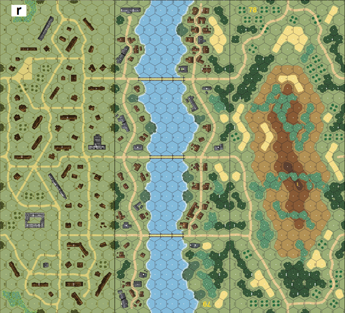 In this playing, the bulk of the German force entered from the South with the objective of crossing the southern most bridge. Another small force entered on the East side with the HMG, MMG, and leader with radio, moving into position on the hill overlooking the battlefield. The Russians set up two Assault Engineers on the southern and middle bridge swith the intent of setting Demo Charges and destroying those bridges. The MMC on the middle bridge broke under fire from Germans on the hill in its attempt to set the DC. On the southern bridge, the MMC failed to set the DC twice and then broke under heavy fire from the overwhelming German forces. On Turn 2, the Germans were able to successfully lay ordnance smoke on the far side of the southern bridge but their approach was slowed by a Russian delaying force on the east side of the river. The leader with radio broke on a long range Russian HMG shot, losing OBA access. Russians placed the MMG in a FH with a fire lane down the southern bridge. As the Germans crossed, the 10-2 leader was pinned and multiple units were broken before the MMG malf'd. The two units that made it across the bridge broke on the far side. The Germans quickly rallied, but the leader with radio was unable to reestablish radio contact for two turns, leaving the bridge crossing dangerously exposed. The Germans pressed on, but the Russian defenders were able to KIA and break more attackers. On the center bridge, a small attacking force attempted to force the crossing, but the Russian HMG was able to hold them back. Radio contact was regained and ordnance smoke laid for another attempt at crossing the southern bridge, this time successfully, helped by fact that the Russian MMG was eliminated during a repair attempt. However, with only 2 turns remaining, the German player conceded given the lack of time to gain control of sufficient buildings for a win.