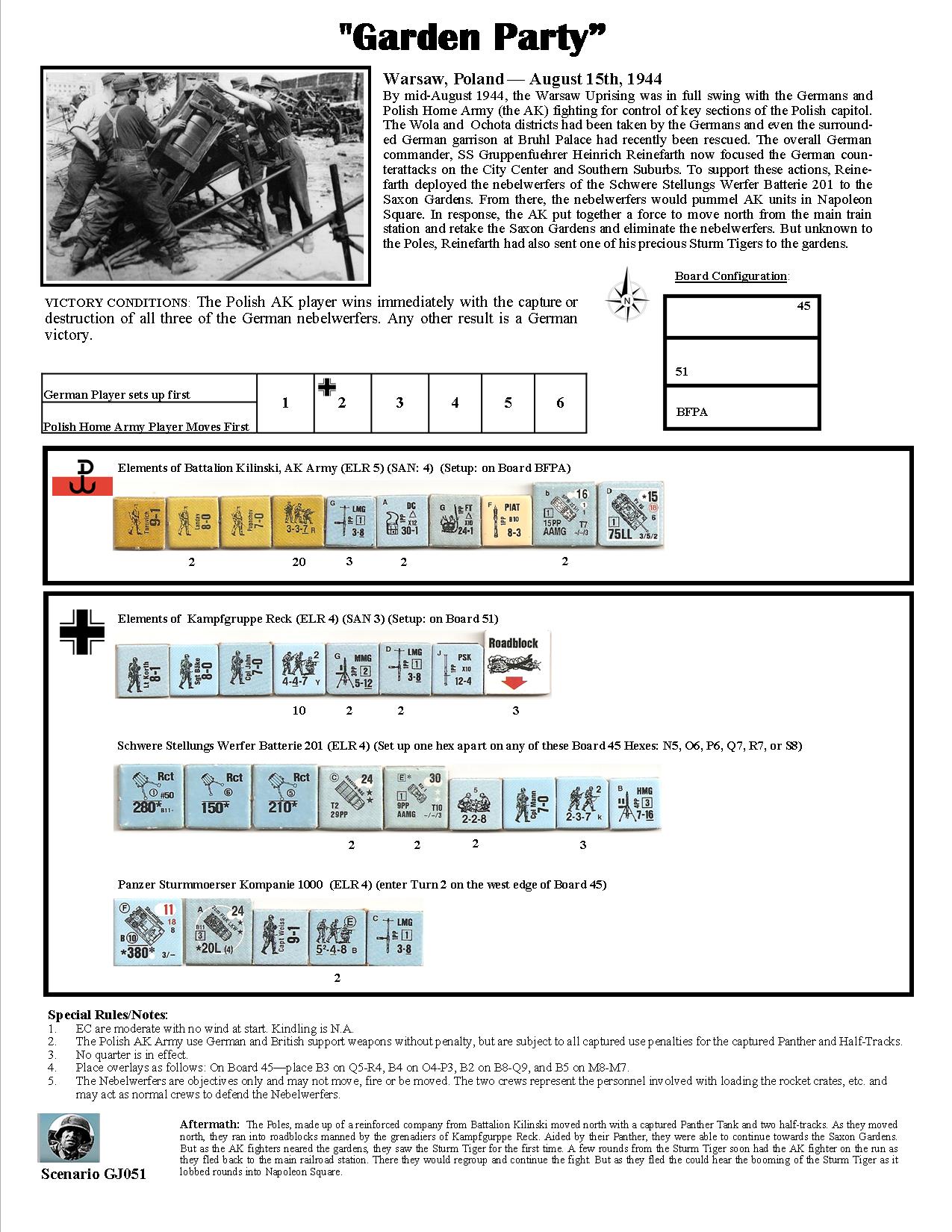 By mid-August 1944, the Warsaw Uprising was in full swing with the Germans and Polish Home Army (the AK) fighting for control of key sections of the Polish capitol. The Wola and Ochota districts had been taken by the Germans and even the surrounded German garrison at Bruhl Palace had recently been rescued. The overall German commander, SS Gruppenfuehrer Heinrich Reinefarth now focused the German counterattacks on the City Center and Southern Suburbs. To support these actions, Reinefarth deployed the nebelwerfers of the Schwere Stellungs Werfer Batterie 201 to the Saxon Gardens. From there, the nebelwerfers would pummel AK units in Napoleon Square. In response, the AK put together a force to move north from the main train station and retake the Saxon Gardens and eliminate the nebelwerfers. But unknown to the Poles, Reinefarth had also sent one of his precious Sturm Tigers to the gardens.Attacker: Polish (Home Army) (Battalion Kilinski)