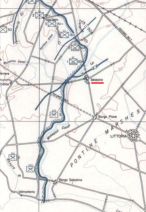 Under the leadership of its new commander, Capt. Underhill, No. 5 Company, FSSF, crossed Bridge 5, shortly after dark and set off for Sessuno. The plan was to seize Sessuno for the night and retire back to friendly lines at daybreak. 1st and 3rd Platoons hit the left and right sides of the town and began working their way to the center. German machine-guns let loose, arcing streams of tracer fire out of the town, while mortars fired flares that illuminated the countryside beneath them. Resistance was fierce at first, but with bazookas and grenades, the platoons began to clear the Germans from the houses.Attacker: American (No. 5 Company, 2d Regiment, FSSF)