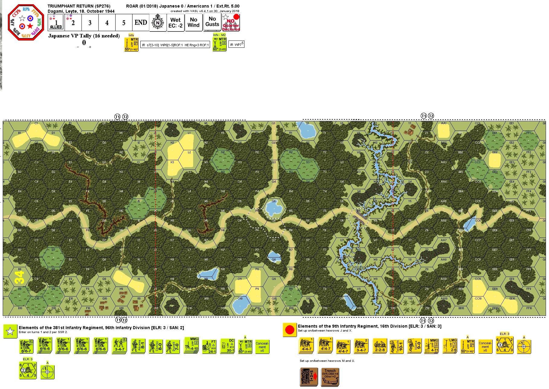 A short 5 Turn one-board PTO action pitting a mostly first line force of Americans vs a mostly first line Japanese force with two Trenches and two Pillboxes (with Tunnels). The objective is for the Japanese to win a certain number of VP which can be done by holding a bridge and two crossroads and by exiting units from the board.