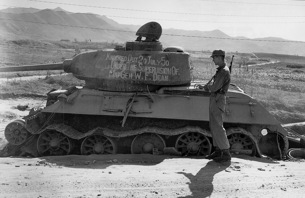 On July 19, North Korean forces entered Taejon, the site of the 24th Infantry Division's headquarters. William Dean personally led the division in its stand at Taejon. The North Koreans quickly surrounded the city and moved in from the west, north and south. For two days, the 34th Infantry fought the advancing North Koreans in bitter house-to-house fighting. North Korean soldiers continued to infiltrate the city, often disguised as farmers. The remaining elements of the 24th Infantry Division were pushed back block by block. Without radios, and unable to communicate with the remaining elements of the division, Dean joined the men on the front lines, hunting the T-34 tanks with the help of the new shaped-charge, armor-piercing 3.5 inch "Super Bazookas", which had only been put into production two weeks before the war. At one point, Dean personally attacked a tank with a hand grenade, destroying it. He also repeatedly directed the fire of US armor in the city while being exposed to North Korean fire. In 1951, Congress voted to award Dean the Medal of Honor for his actions during the defense of Taejon.Attacker: North Korean (4th Division and 105th Seoul Armored Division)