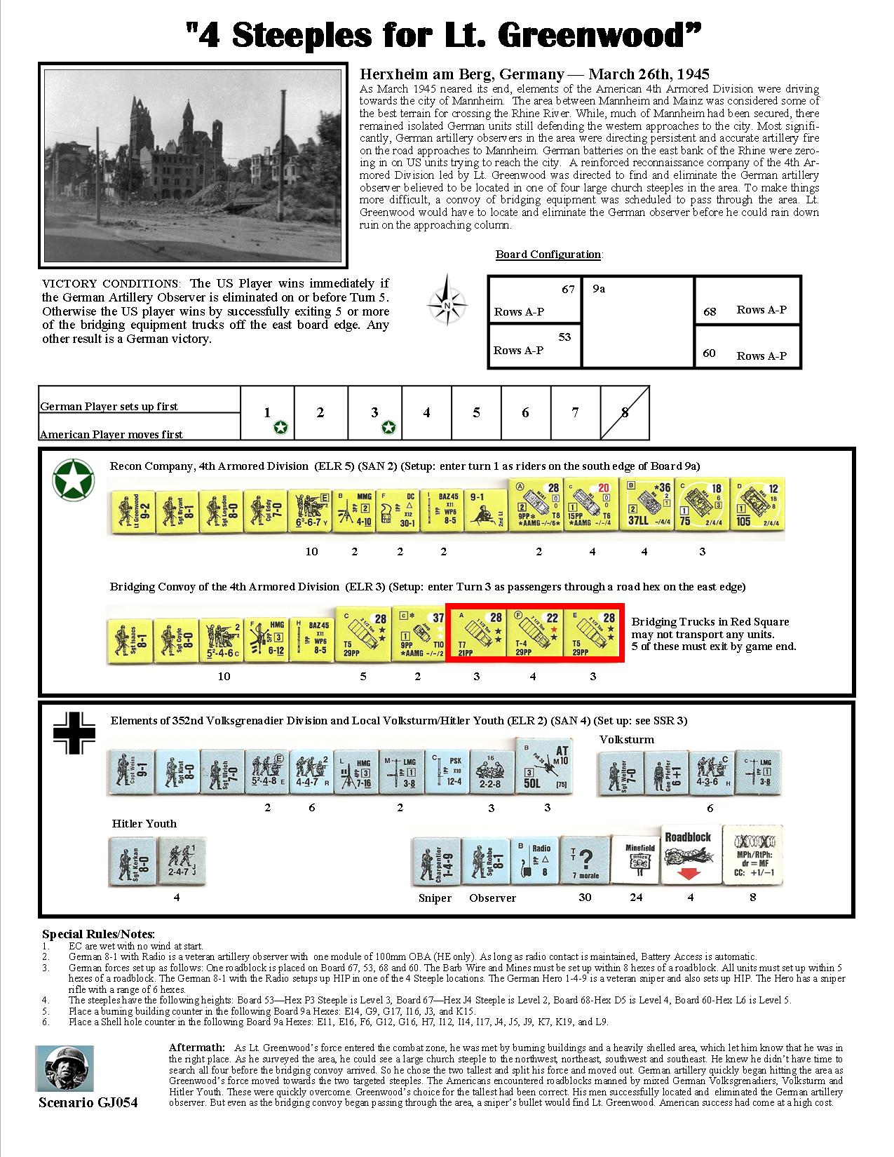As March 1945 neared its end, elements of the American 4th Armored Division were driving towards the city of Mannheim. The area between Mannheim and Mainz was considered some of the best terrain for crossing the Rhine River. While, much of Mannheim had been secured, there remained isolated German units still defending the western approaches to the city. Most significantly, German artillery observers in the area were directing persistent and accurate artillery fire on the road approaches to Mannheim. German batteries on the east bank of the Rhine were zeroing in on US units trying to reach the city. A reinforced reconnaissance company of the 4th Armored Division, led by Lt. Greenwood, was directed to find and eliminate the German artillery observer believed to be located in one of four large church steeples in the area. To make things more difficult, a convoy of bridging equipment was scheduled to pass through the area. Lt. Greenwood would have to locate and eliminate the German observer before he could rain down ruin on the approaching column. As Lt. Greenwood’s force entered the combat zone, he was met by burning buildings and a heavily shelled area, which let him know that he was in the right place. As he surveyed the area, he could see large church steeples to the northwest, northeast, southwest and southeast...Attacker: American (US 4th Armored Division)