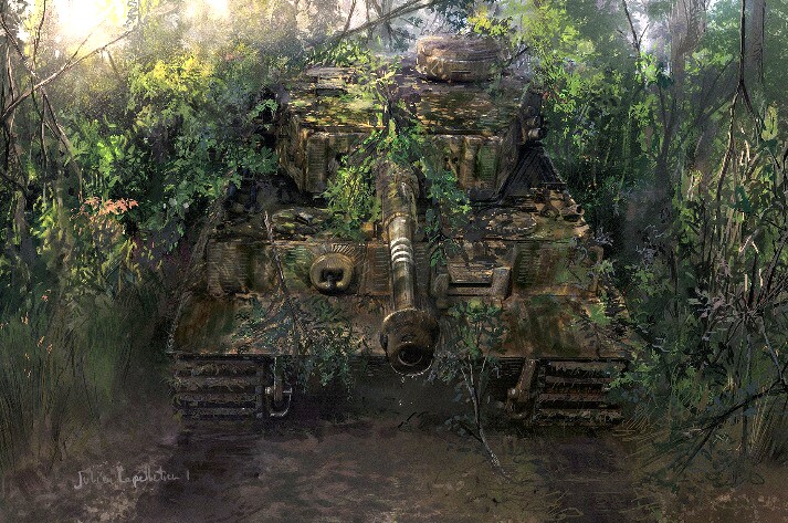 "Tiger Hunt" -- The chaos created in the German lines by the Soviet offensive was indescribable. The Tiger of Lieutenant Wulf, sole survivor of his platoon was trying to find his regiment when they were spotted by a Soviet airplane. Deciding that the better course of action would be to hold in place, Wulf camouflaged his tank and waited. Soon a platoon of T-34/85s appeared. . .Attacker: Russian (Platoon of Soviet armor)