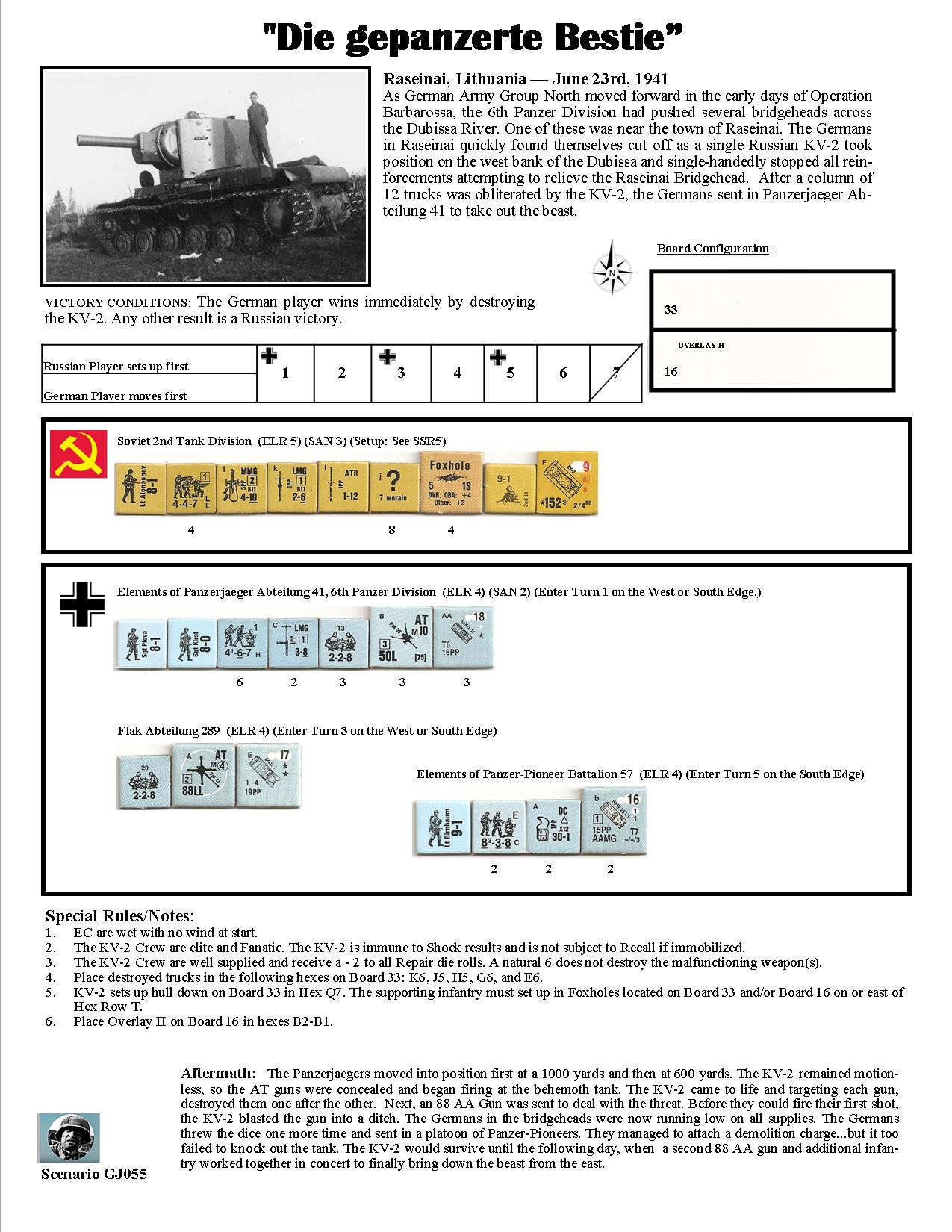 As German Army Group North moved forward in the early days of Operation Barbarossa, the 6th Panzer Division had pushed several bridgeheads across the Dubissa River. One of these was near the town of Raseinai. The Germans in Raseinai quickly found themselves cut off as a single Russian KV-2 took position on the west bank of the Dubissa and single-handedly stopped all reinforcements attempting to relieve the Raseinai Bridgehead. After a column of 12 trucks was obliterated by the KV-2, the Germans sent in Panzerjaeger Abteilung 41 to take out the beast.Attacker: German (Elements of Panzerjaeger Abteilung 41, 6th Panzer Division and Flak Abteilung 289 and Panzer-Pioneer Battalion 57)
