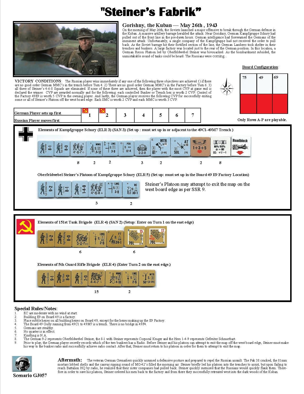 On the morning of May 26th, the Soviets launched a major offensive to break through the German defense in the Kuban. A massive artillery barrage heralded the attack. Near Gorishny, German Kampfgruppe Schury had pulled out of the front line in the pre-dawn hours. German intelligence had forewarned the Germans of the imminent attack. Unfortunately, a single company of the Kampfgruppe had not received the order to pull back. As the Soviet barrage hit their fortified section of the line, the German Landsers took shelter in their trenches and bunkers. A large factory was located just to the rear of the German position. In this location, a German Recon Platoon led by Oberfeldwebel Steiner was bivouacked. As the bombardment subsided, the unmistakable sound of tanks could be heard. The Russians were coming...Attacker: Russian (151st Tank Brigade and 5th Guards Rifle Brigade)