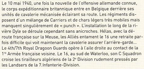 On May 10, 1940, once the news of the German offensive was known, the British Expeditionary Corps entered Belgium with its units of mechanized cavalry leading its way. The regiments had a mix of Carriers and light tanks - very mobile but lacking “punch”. Their deployment along the river Dyle unfolded, however, without any hitch. Alas, with the French rout to the Meuse, the Allies started on the 16th a difficult retirement with cavalry as the rearguard. The 4th / 7th Royal Dragoon Guards, operated on the right wing in contact with the 1st French Armee adjoining. On the 16th, south of Waterloo, C Squadron crossed through the Algerian infantrymen of the 2nd Division, roughly pressed by the Landsers of the 7th Infantry Division.Attacker: German (7. Infanterie Division)