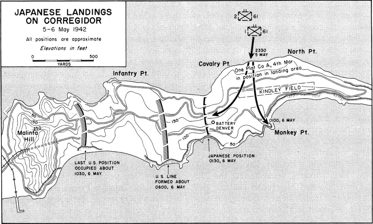 The Japanese amphibious assault on the north shore of Corregidor began before midnight. It was rapidly becoming a major disaster. The landing boats and barges came under heavy fire from American guns on Corregidor and Fort Hughes on nearby Caballo Island. By the time the bulk of 1st Battalion had landed, most of the infantry companies had suffered 50 – 70% casualties. To make matters worse, 2nd Battalion was coming ashore on the wrong flank of 1st Battalion. To prevent the situation from devolving further, Colonel Sato, commander of the 61st Infantry Regiment, ordered all units to proceed to their objectives regardless of where they came ashore. 2nd Battalion would advance towards Kindley Airfield once they had completed unloading from their boats. Meanwhile, 1st Battalion would split into two forces with one heading west towards Malinta Hill and the other south across the “tail” of Corregidor towards Monkey Point. 1" Battalion's advance towards Monkey Point met with strong resistance from Marines stationed just inland from the beaches. When the 2nd Battalion finally moved towards Kindley Airfield, they came under intense fire from previously undisclosed batteries of American 75mm howitzers and 37mm AT guns located near North Point. To one American observer, the entire area lit up by tracers and explosions "looked like a Fourth of July display".Attacker: Japanese (4th Infantry Division)