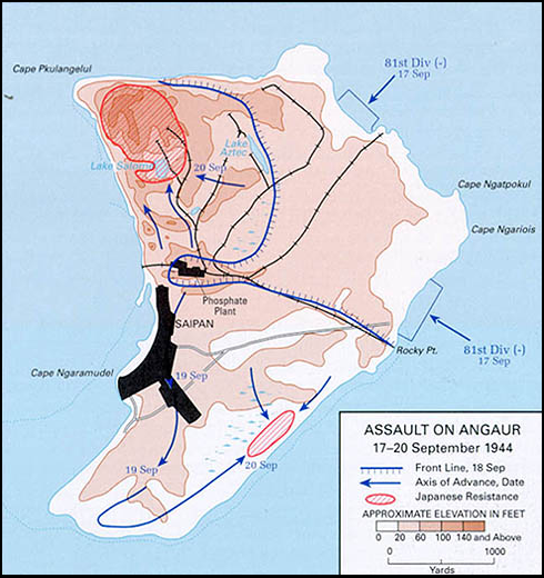 Anguar Island had been declared secure on 20 September. However, the Japanese still held out in the northwestern part of the island around Romauldo Hill. The hill had been fortified as a redoubt using interconnected caves and pillboxes. To attack the redoubt, the 322nd Regimental Combat team from the 81st “Wildcat” Infantry Division had to attack across an open-pit, phosphate mine called the “Angaur Bowl”. The attacks began on 20 September and the Wildcats quickly established a tactical pattern attacking into the difficult terrain and destroying the mutually-supporting Japanese fortifications. On September 27 the Americans were able to get tanks into the bowl along a new road bulldozed the previous day.Attacker: American (2nd Battalion, 322nd Infantry Regiment, 81st Infantry Division)