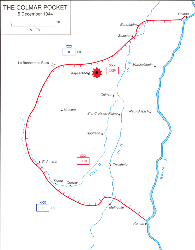 Kaysersberg was a small town situated at the end of the Weiss Valley just before the Alsatian plain in eastern France. At the end of 1944 both sides knew that this town was essential to protect the Colmar Pocket, the last large German foothold in France. The US 36th ID had been blocked and had taken heavy loses while trying to take the town. On the 17th they nevertheless managed to take half of Kayserberg but their AFV support from the Free French 5ème Division Blindée was blocked by the river crossing the middle of the town. They requested help from the 1er Régiment de Chasseurs d’Afrique (5ème DB) and other elements of the 36th ID that have just taken Kientzheim on the northeast. With the support of 25 men from the 30th IR, several elements of the 5ème DB (2 platoons of Foreign Legion and several tanks) launched an attack from behind on the morning of the 18th.Attacker: American / Free French (31st Infantry Regiment, 36th Infantry Division and 30th Infantry Regiment, 3rd Infantry Division with Régiment de Marche de la Légion Etrangère (RMLE) and 1er Régiment de Chasseurs d'Afrique)
