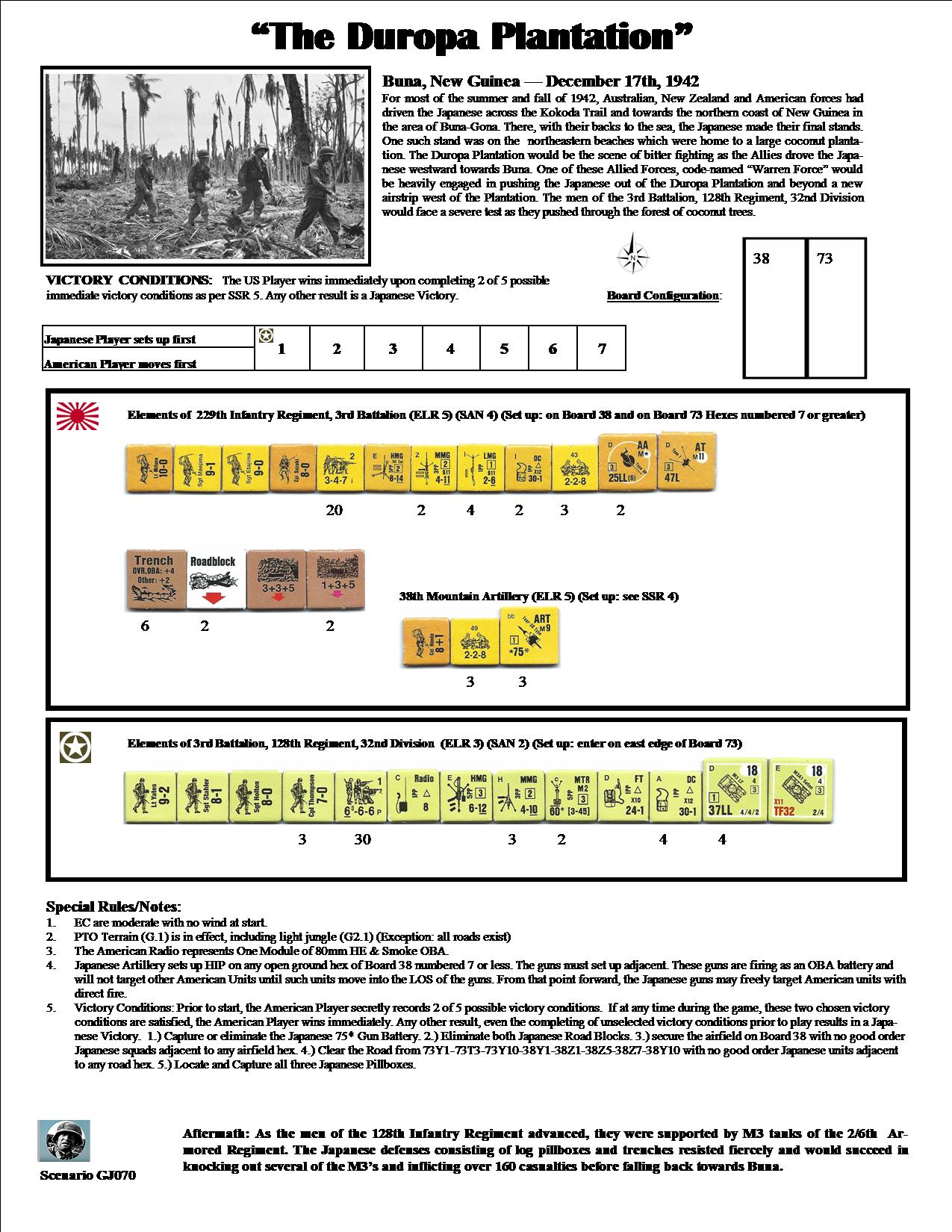 For most of the summer and fall of 1942, Australian, New Zealand and American forces had driven the Japanese across the Kokoda Trail and towards the northern coast of New Guinea in the area of Buna-Gona. There, with their backs to the sea, the Japanese made their final stands. One such stand was on the northeastern beaches which were home to a large coconut plantation. The Duropa Plantation would be the scene of bitter fighting as the Allies drove the Japanese westward towards Buna. One of these Allied Forces, code-named “Warren Force” would be heavily engaged in pushing the Japanese out of the Duropa Plantation and beyond a new airstrip west of the Plantation. The men of the 3rd Battalion, 128th Regiment, 32nd Division would face a severe test as they pushed the forest of coconut trees.Attacker: American (3rd Battalion, 128th Regiment, 32nd Infantry Division)
