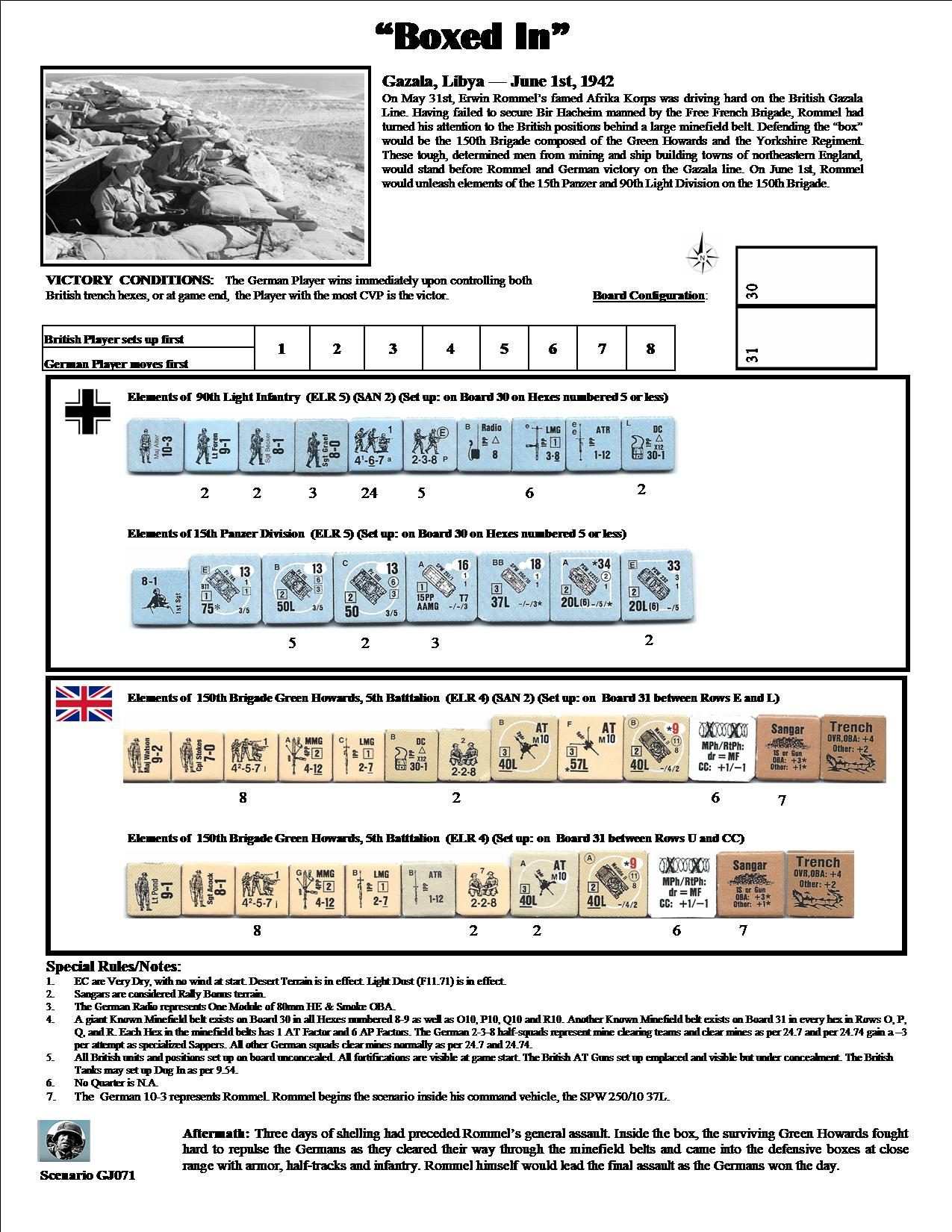 On May 31st, Erwin Rommel’s famed Afrika Korps was driving hard on the British Gazala Line. Having failed to secure Bir Hacheim manned by the Free French Brigade, Rommel had turned his attention to the British positions behind a large minefield belt. Defending the “box” would be the 150th Brigade composed of the Green Howards and the Yorkshire Regiment. These tough, determined men from mining and ship building towns of northeastern England, would stand before Rommel and German victory on the Gazala Line. On June 1st, Rommel would unleash elements of the 15th Panzer and 90th Light Division on the 150th Brigade.Attacker: German (90th Light Infantry and 15th Panzer Division)