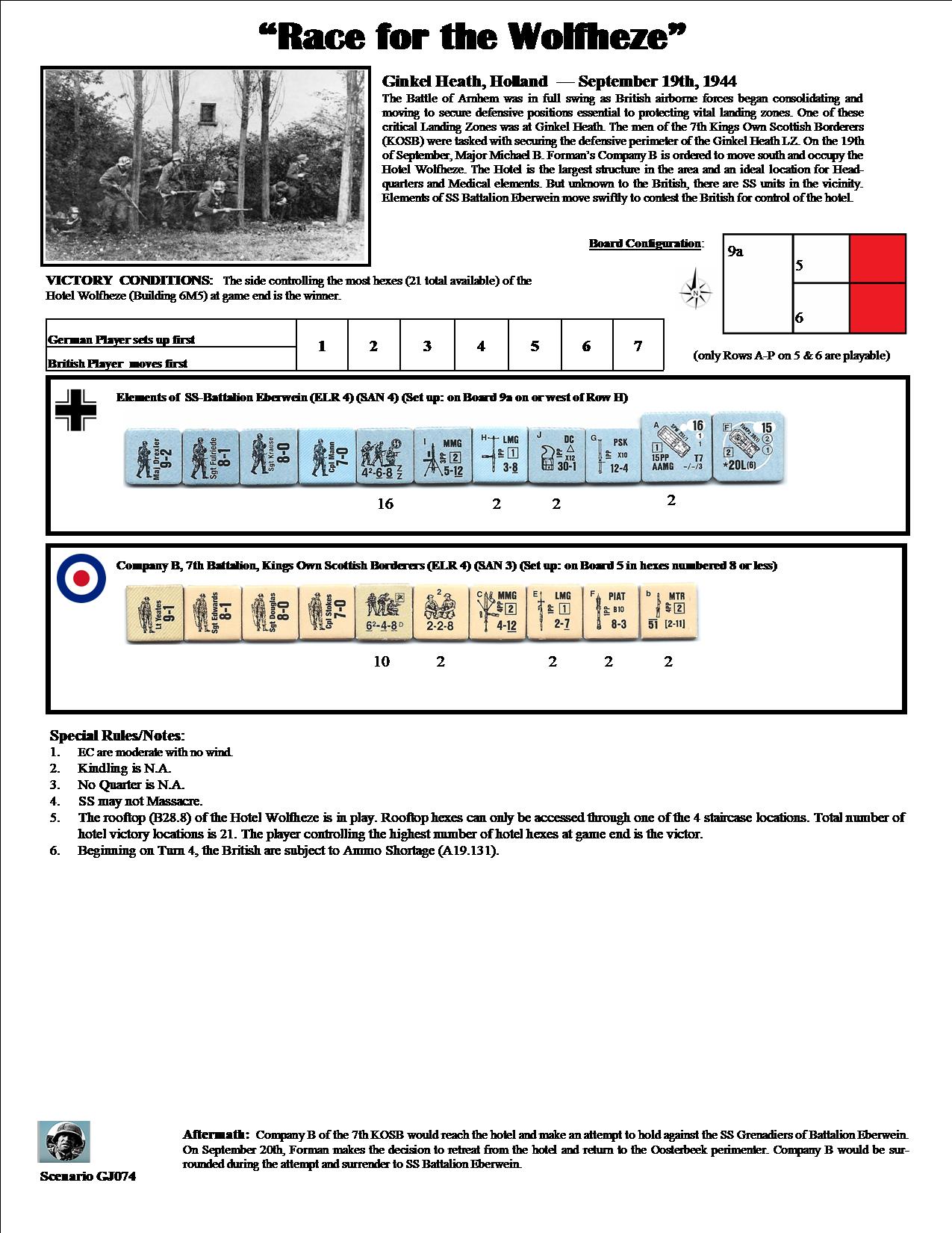 The Battle of Arnhem was in full swing as British airborne forces began consolidating and moving to secure defensive positions essential to protecting vital landing zones. One of these critical Landing Zones was at Ginkel Heath. The men of the 7th Kings Own Scottish Borderers (KOSB) were tasked with securing the defensive perimeter of the Ginkel Heath LZ. On the 19th of September, Major Michael B. Forman’s Company B was ordered to move south and occupy the Hotel Wolfheze. The Hotel was the largest structure in the area and an ideal location for Headquarters and medical elements. But unknown to the British, there were SS units in the vicinity. Elements of SS Battalion Eberwein moved swiftly to contest the British for control of the hotel.Attacker: British (Company B, 7th Battalion KOSB)