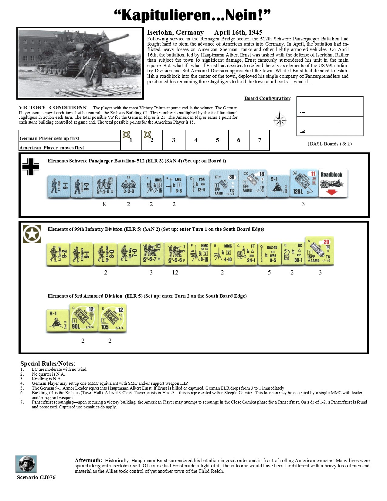 Following service in the Remagen Bridge sector, the 512th Schwere Panzerjaeger Battalion had fought hard to stem the advance of American units into Germany. In April, the battalion had inflicted heavy losses on American Sherman Tanks and other lightly armored vehicles. On April 16th, the battalion, led by Hauptmann Albert Ernst was tasked with the defense of Iserlohn. Rather than subject the town to significant damage, Ernst famously surrendered his unit in the main square. But..what if...what if Ernst had decided to defend the city as elements of the US 99th Infantry Division and 3rd Armored Division approached the town. What if Ernst had decided to establish a roadblock into the center of the town, deployed his single company of Panzergrenadiers and positioned his remaining three Jagdtigers to hold the town at all costs….what if..Attacker: American (99th Infantry Division with 3rd Armor Division)