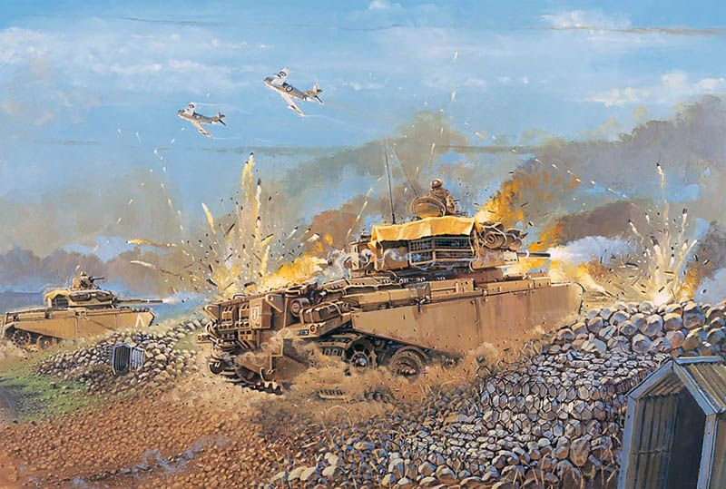 At 1350 hrs, the peace and quiet of Yom Kippur was shattered by a massive Syrian artillery barrage and the exploding bombs of Syrian MIGs. Askarov immediately leapt into his tank at the Hushniyah base and drove eastwards towards the Purple Line summoning other tanks of the battalion to follow him. Once at the Purple Line, his She’t and a companion Centurian mounted the tank firing ramps of Mutzav 111, overlooking Kudne. The infantry strongpoint was defended by a platoon from the 50th Paratroop Battalion. The hillock on which Mutzav 111 was situated offered a clear view across the 1967 demarcation line. The Syrian bombardment had been underway for almost an hour when clouds of dust were clearly seen approaching from the east.Attacker: Syrian (9th Infantry Division)