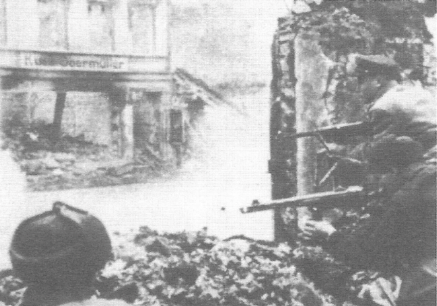 1st Battalion of the 756th Rifle Regiment had been instrumental in the daring April 28th night crossing of the Moltke Bridge and establishing a bridgehead in the house directly across Moltke Strasse from the massive, six story Ministry of the Interior building, "Himmler's House". By dawn, most of the lead regiments of both divisions and a motorized flamethrower battalion had crossed the river Spree. The buildings on the opposite side of the Moltke Strasse had their entrances directly opposite that of the Interior Ministry building itself so fire bases were established and assault groups organized for a morning attack.Attacker: Russian (10th Independent Motorized Flamethrower Battalion, 756th Rifle Regiment, 150th Division and 525th Rifle Regiment, 171st Division)