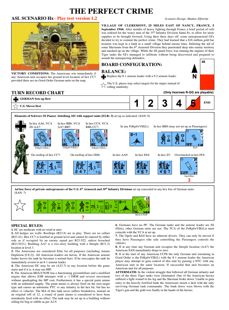 After months of heavy fighting through France, a brief period of refit was ordered for the weary men of the 35th Infantry Division Santa Fe, to allow for more supplies to be brought forward. Using their three days off, some entrepreneurial GI's decided to try to commit the perfect crime. They had learned that a $16 million gold bar treasure was kept in a bank in a small village behind enemy lines. Enlisting the aid of some Shermans from the 6th Armored Division they penetrated deep into enemy territory and sneaked up on the village. While some SS guard force was running the engines of the Tiger tanks, the GI's managed to infiltrate without being discovered and prepared to assault the unsuspecting defenders.Attacker: American (Ad hoc force pf private entrepreneurs of the U.S. 6th Armored and 35th Infantry Divisions)