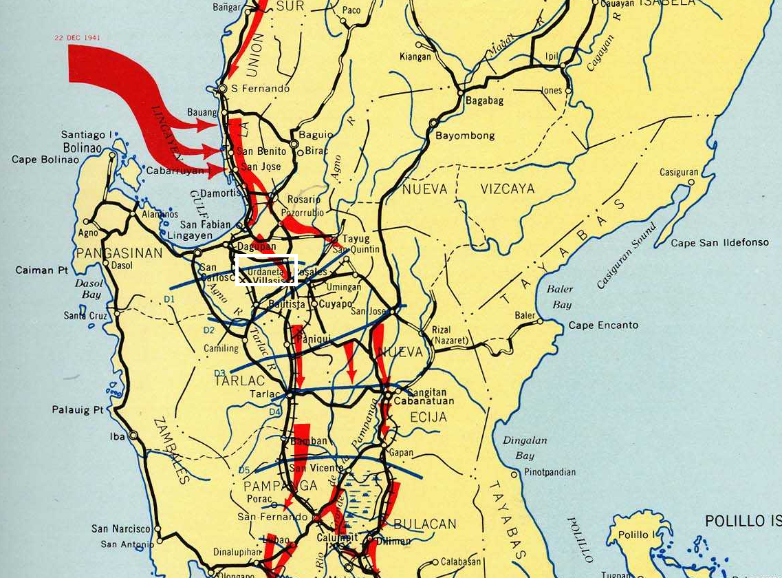 The Japanese had landed at Lingayen Bay with 43,000 troops composed mostly of the 48th Division which had been activated in 1940 on the island of Formosa and which had not yet seen battle. Using landing craft and powered sampans, the Japanese landed in several waves and on 22 December advanced in tank-infantry columns. The American-Filipino force reacted quickly but was soon forced to retreat whereupon they established a series of defensive lines further south to withdraw in order. The forces under General Wainwright, commander of the North Luzon Force, ahd been badly disorganized over the previous days' fighting at the landing sites, and the first defensive line ("D-1") was simply a line on the map where he could reform his troops. While most of the line did reorganize and withdrew to "D-2" under the safety of screening forces by 25 December, the 11th Division had a less peaceful Christmas Day. The 11th dug in around the small village of Urdaneta where they met the 1st Formosan Regiment.Attacker: Japanese (1st Formosan Infantry Regiment)