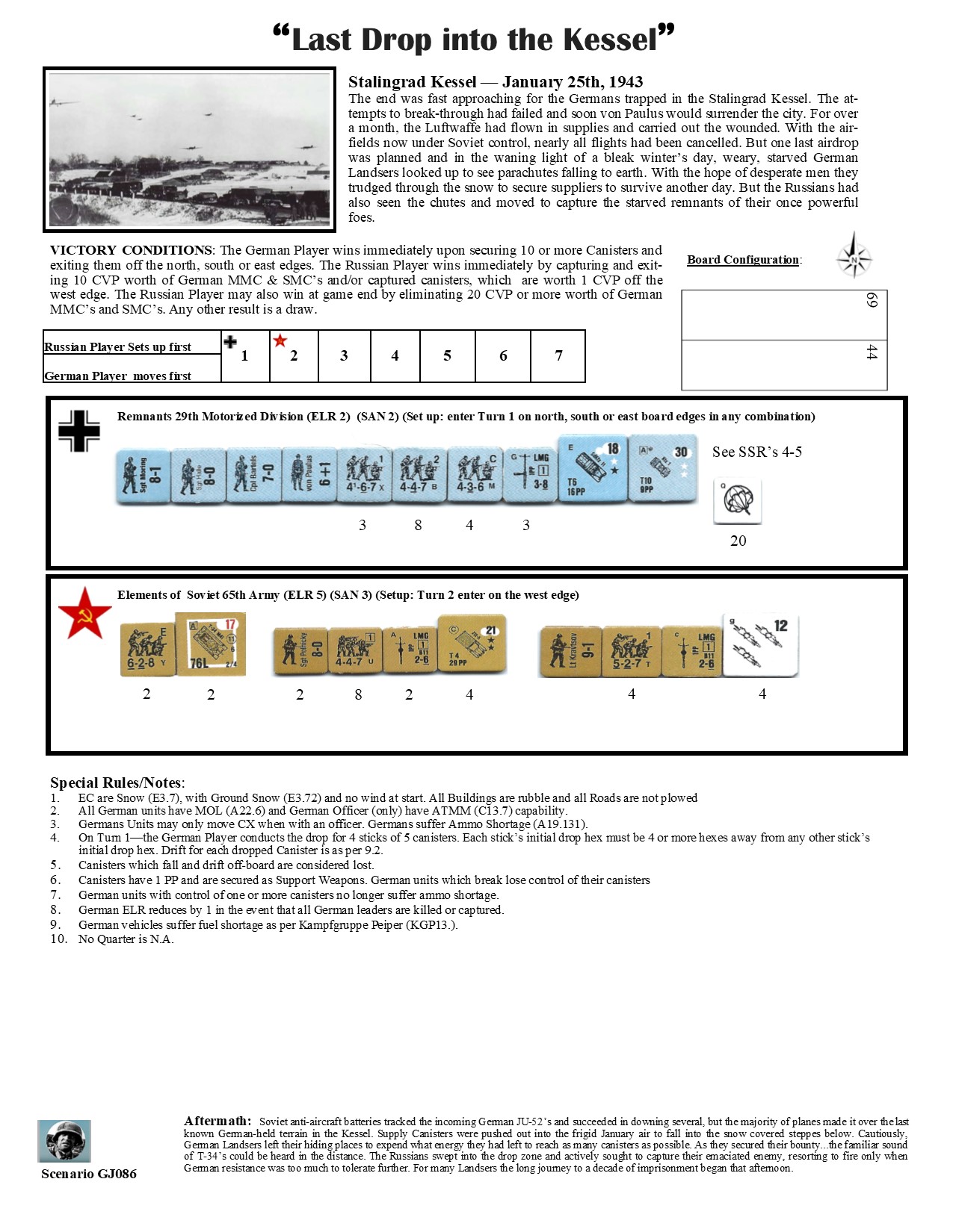 | Misc Rules: | Snow (E3.7), GS (E3.72) Buildings rubbled, no plowed roads. A: AS (A19.31), Supply Drop |