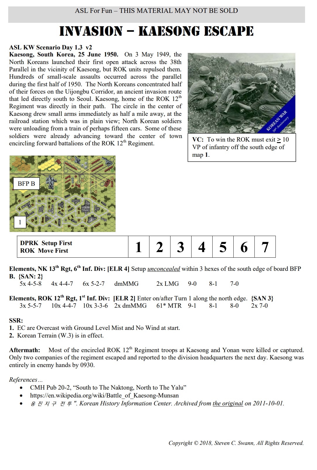 Kaesong, South Korea, 25 June 1950. On 3 May 1949, the North Koreans launched their first open attack across the 38th Parallel in the vicinity of Kaesong, but ROK units repulsed them. Hundreds of small-scale assaults occurred across the parallel during the first half of 1950. The North Koreans concentrated half of their forces on the Uijongbu Corridor, an ancient invasion route that led directly south to Seoul. Kaesong, home of the ROK 12th Regiment was directly in their path. The circle in the center of Kaesong drew small arms immediately as half a mile away, at the railroad station which was in plain view; North Korean soldiers were unloading from a train of perhaps fifteen cars. Some of these soldiers were already advancing toward the center of town encircling forward battalions of the ROK 12th Regiment. (Scenario in PDF format can be found under USER FILES below)Attacker: Republic of Korea (12th Regiment, 1st Infantry Division)