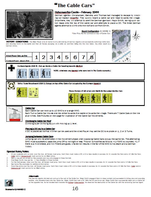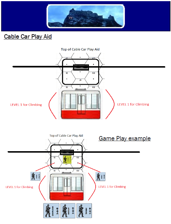 German Agents — Christiansen, Berkeley and Thomas — had managed to escape by knocking out Captain Shaeffer. They quickly board a cable car and head towards the village. Once there, they will attempt to alert the German garrison. Major Smith, taking quick action leaps onto the top of the cable car and attempts to place a DC. The three German agents attempt to climb onto the roof and confront Smith.Attacker: German (German agents)