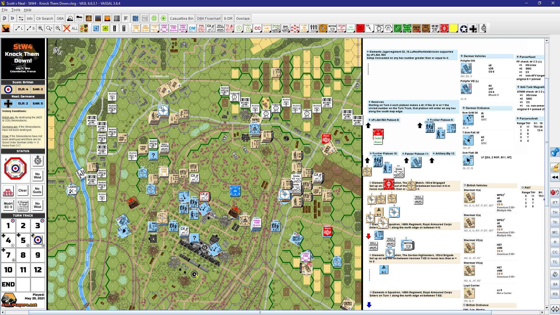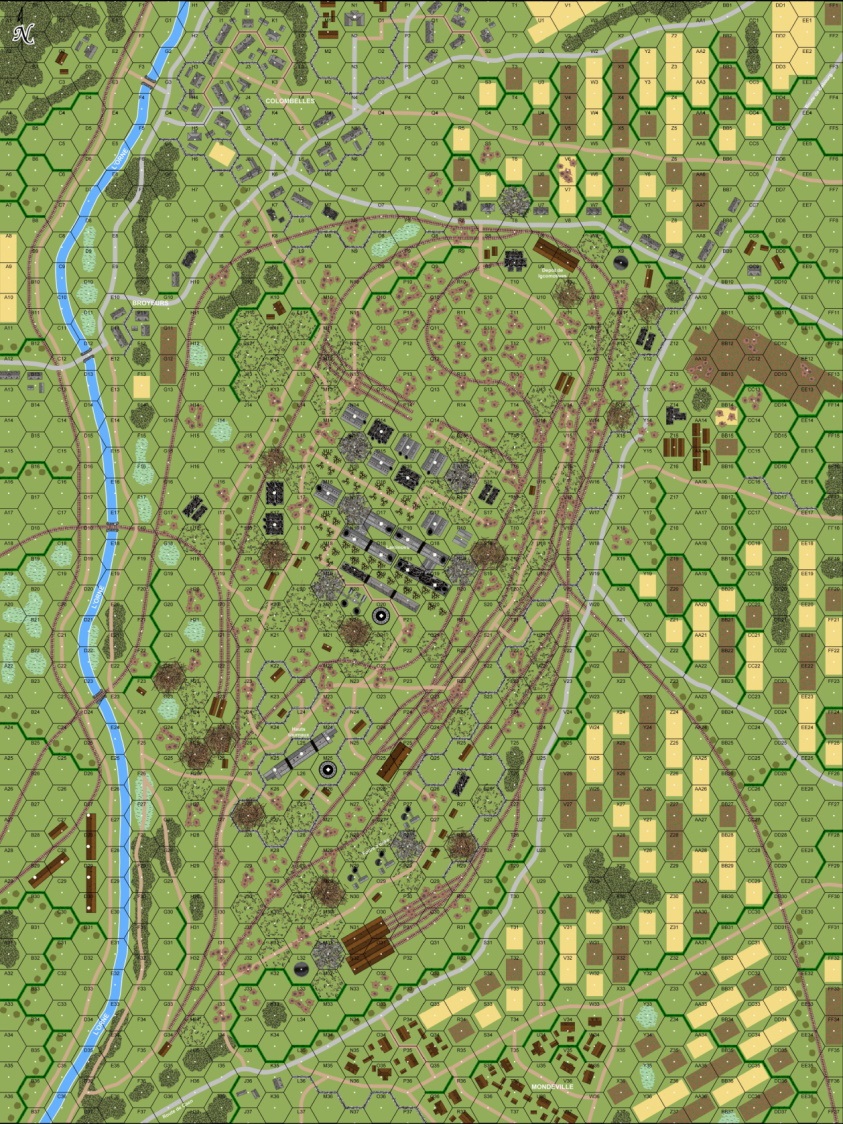 The entire area was dominated by the smokestacks of the giant steel factory at Colombelles. These smokestacks were the ideal observation posts over the battlefield for the Germans. General Montgomery decided on an operation to take these smokestacks out, aptly called Operation STACK, and the 51st (Highland) Division was tasked to carry it out. The 1st Battalion, The Gordon Highlanders (1st Gordons) on the right would clear the village of Colombelles and then advance into the Steelworks from the northwest. On the left, the 5th Battalion, The Black Watch (Royal Highland Regiment)(5th Black Watch) would capture the crossroads east of Colombelles and the advance into the Steelworks from the northeast.Attacker: British (153rd Infantry Brigade)