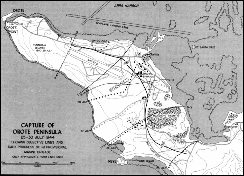 Six weeks after Operation FORAGER crashed ashore on Saipan, American commanders turned their attention to the liberation of Guam. Two points on the island's eastern shore were selected for the initial beach landings. The assault force comprised the 3rd Marine Division (3rd, 9th, and 21st Marines) reinforced by the 1st Provisional Marine Brigade (4th and 22nd Marines) and the Army's 77th Division. On 21 July, the first waves of LVTs stormed the beaches close behind a thunderous naval barrage and bombing by swarms of U.S. Navy and Marine aircraft. The Japanese, for their part, were ready for the onslaught, and caused considerable delay to American efforts at consolidating the twin beachheads into one. By D+5 the Orote Peninsula was the last Japanese stronghold on the eastern side of the island. The 4th and 22nd Marines were ordered to attack the peninsula and seize Orote airfield, as well as the old Marine Barracks, abandoned since the Japanese invasion in December 1941.Attacker: American (USMC) (2nd Battalion, 22nd Marine Regiment, 1st Provisional Marine Brigade)