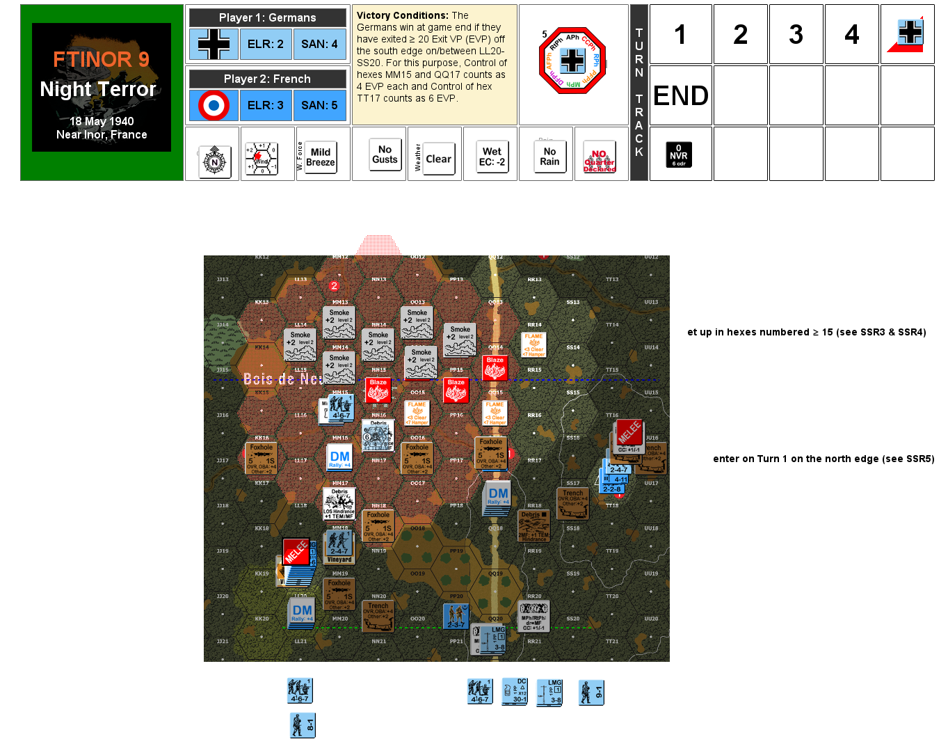 VASL setup file under USER FILES. . .The fight in the woods around Inor had been ongoing for three days and the French line was holding firm. On the 18th, the 68th Infanterie Division tried to break the line near the Soiry Farm and in the woods of Neudan without success. With night, a last push was decided after an artillery preparation .Attacker: German (No more details)
