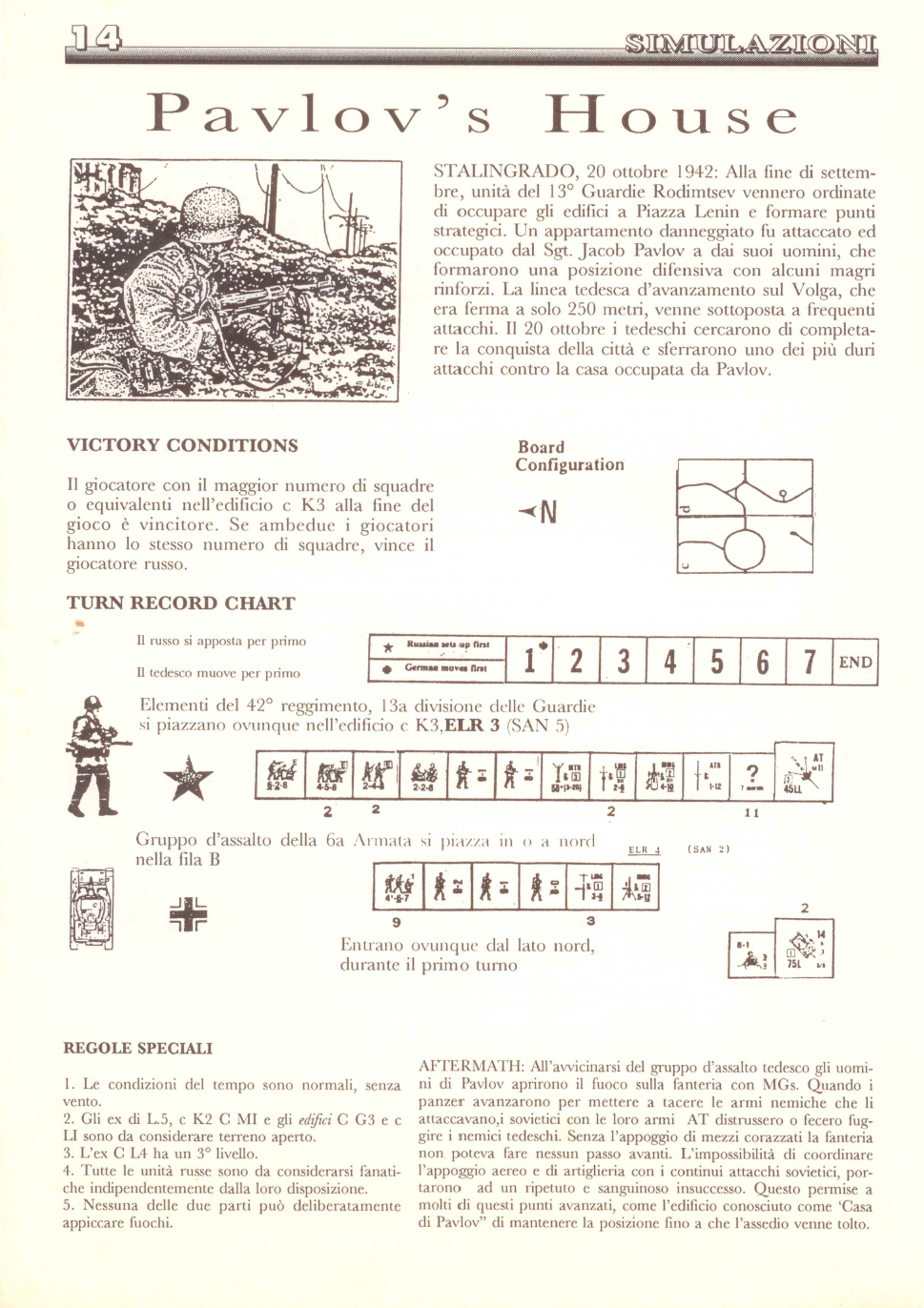 At the end of September, units of the Rodimtsev’s 13th Guards were ordered to occupy the buildings at Lenin Square and form strategic points. A damaged apartment was attacked and occupied by Sgt. Jacob Pavlov and his men, who formed a defensive position with some meager reinforcements. The German line of advance on the Volga, which was stopped short by only 250 meters, was subjected to frequent attacks. On 20 October the Germans tried to complete the conquest of the city and launched one of the most severe attacks on the house occupied by Pavlov. . . .SPECIAL RULES: 1) Weather conditions are normal, no wind. . . 2) The hexes of dL5, cK2, cM1 and buildings cG3 and cL1 are to be considered open ground. . . .3) Hex cL4 has a Level 3 .... 4) All Russian units are to be considered fanatics regardless of their disposition. . . .5) Neither party may deliberately start fires. . . . VICTORY CONDITIONS: The player with the most squads or equivalent in the cK3 building at the end of the game is the winner. If both players have the same number of squads, the Russian player wins.Attacker: German (Assault Group of the 6th Army)