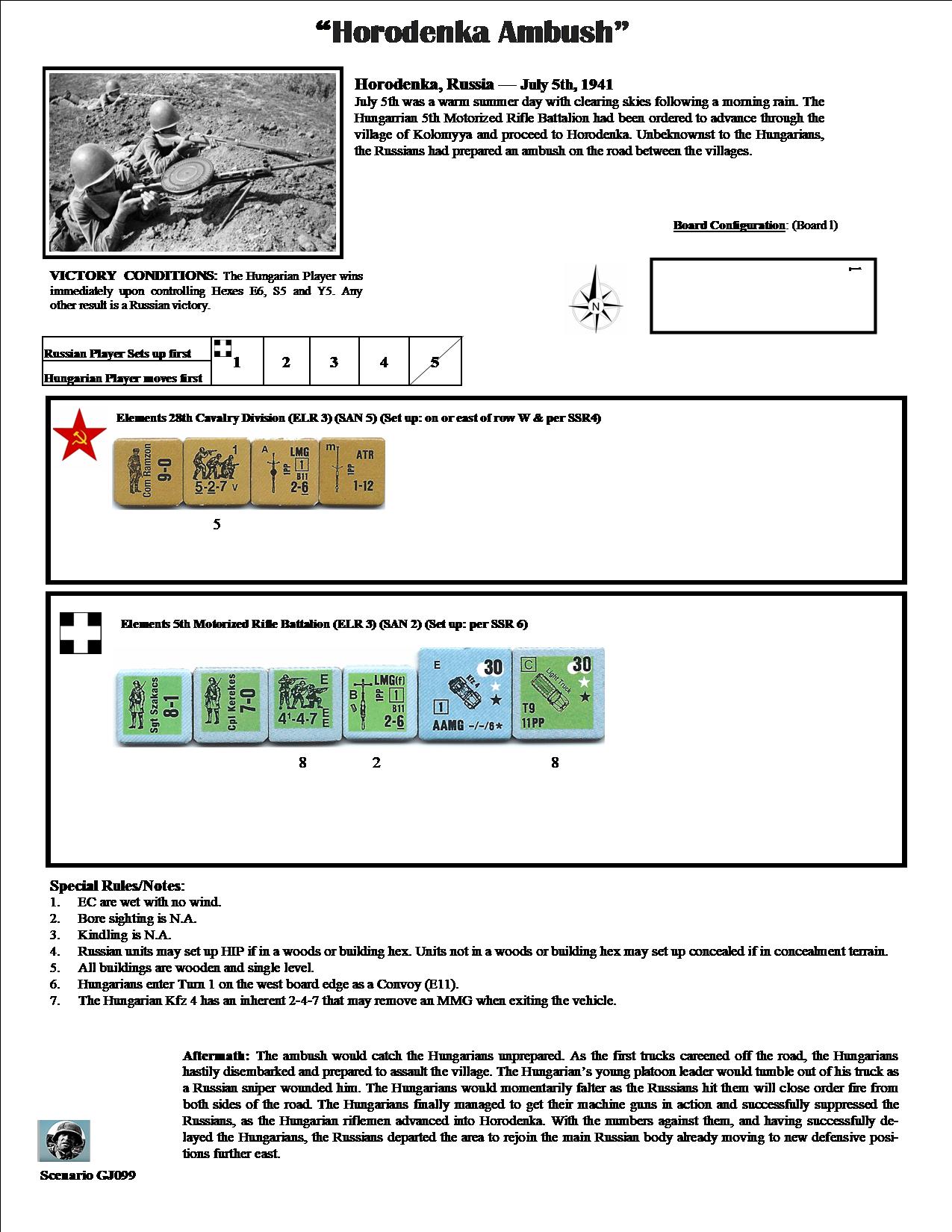 July 5th was a warm summer day with clearing skies following a morning rain. The Hungarian 5th Motorized Rifle Battalion had been ordered to advance through the village of Kolamyya and proceed to Horodenka. Unbeknownst to the Hungarians, the Russians had prepared an ambush on the road between the villages.Attacker: Hungarian (5th Motorized Rifle Battalion)