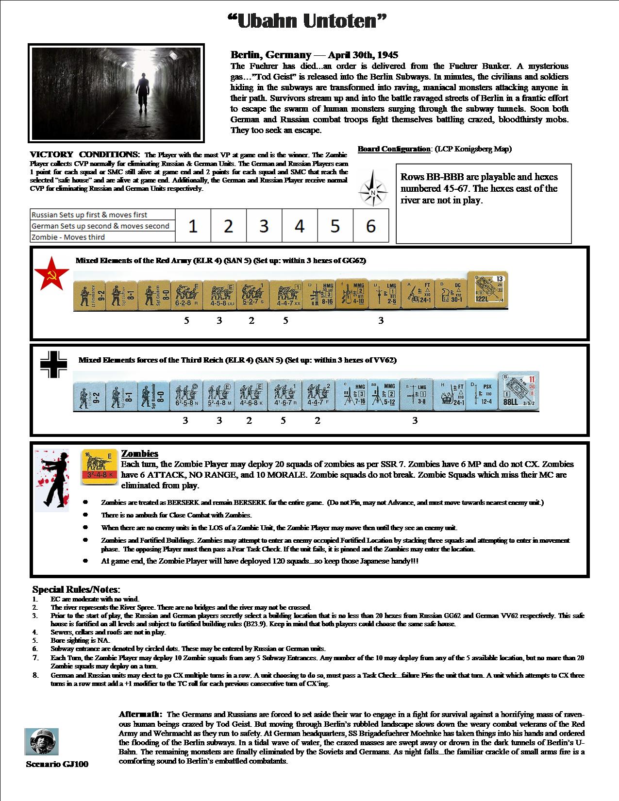 The Fuehrer has died...an order is delivered from the Fuehrer Bunker. A mysterious gas..."Tod Geist" is released into the Berlin Subways. In minutes, the civilians and soldiers hiding in the subways are transformed into raving, maniacal monsters attacking anyone in their path. Survivors stream up and into the battle ravaged streets of Berlin in a frantic effort to escape the swarm of human monsters surging through the subway tunnels. Soon both German and Russian combat troops find themselves battling crazed, bloodthirsty mobs. They too seek an escape.Attacker: Zombie (Subway Undead)