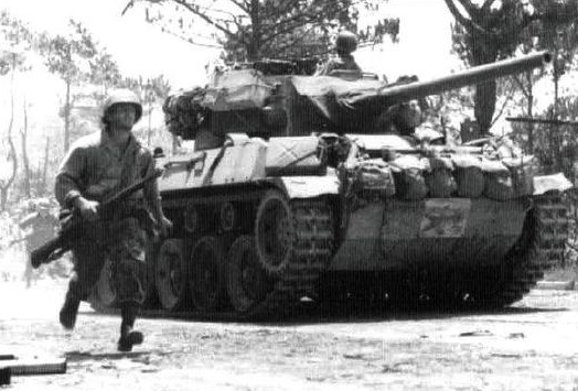 Many of the Japanese troops defending Clark Field were less than front-line quality. Lieutenant Colonel Seikuke Eguchi, however, scrounged for them every available machine gun from the destroyed aircraft littering the runways. As the remains of Kembu Group were being pushed into the foothills of the Zambales Mountains, Eguchi decided to counterattack. After clearing Clark Field, the “Battling Buckeyes” of the 37th pushed into the ruins of Fort Scotsenberg. On the morning of the 29th, Eguchi’s infantry hit the American defenses, and were repulsed. Another counterattack led by six tanks of the Yanagimoto Detachment struck the right flank at Barrio Tacondo.Attacker: Japanese (Eguchi Detachment)