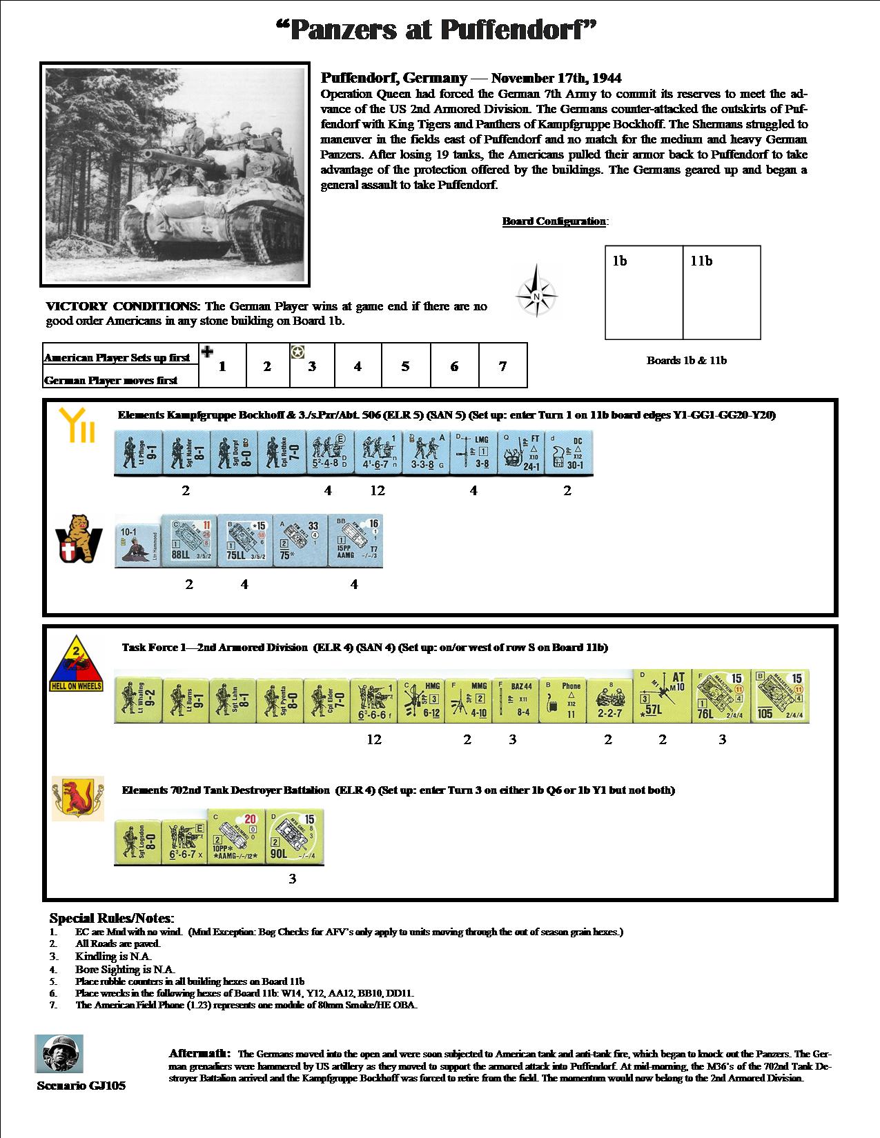 Operation Queen had forced the German 7th Army to commit its reserves to meet the advance of the US 2nd Armored Division. The Germans counter-attacked the outskirts of Puffendorf with King Tigers and Panthers of Kampfgruppe Bockhoff. The Shermans struggled to maneuver in the fields east of Puffendorf and no match for the medium and heavy German Panzers. After losing 19 tanks, the Americans pulled their armor back to Puffendorf to take advantage of the protection offered by the buildings. The Germans geared up and began a general assault to take Puffendorf.Attacker: German (Kampfgruppe Bockhoff & Hvy. Panzer Abteilung 506)