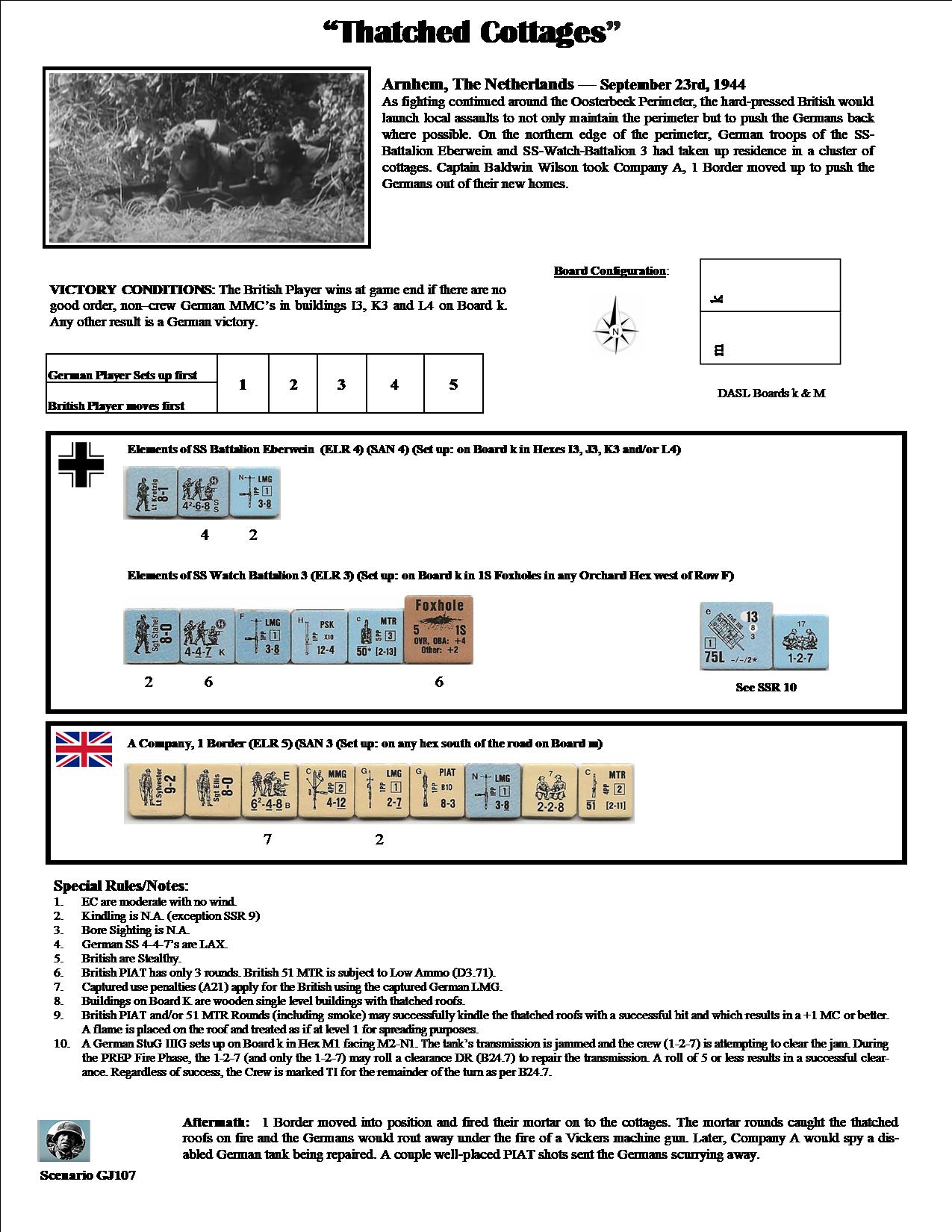 As fighting continued around the Oosterbeek Perimeter, the hard-pressed British would launch local assaults to not only maintain the perimeter but to push the Germans back where possible. On the northern edge of the perimeter, German troops of the SS-Battalion Eberwein and SS-Watch-Battalion 3 had taken up residence in a cluster of cottages. Captain Baldwin Wilson took Company A, 1 Border moved up to push the Germans out of their new homes.Attacker: British (A Company, 1 Border)