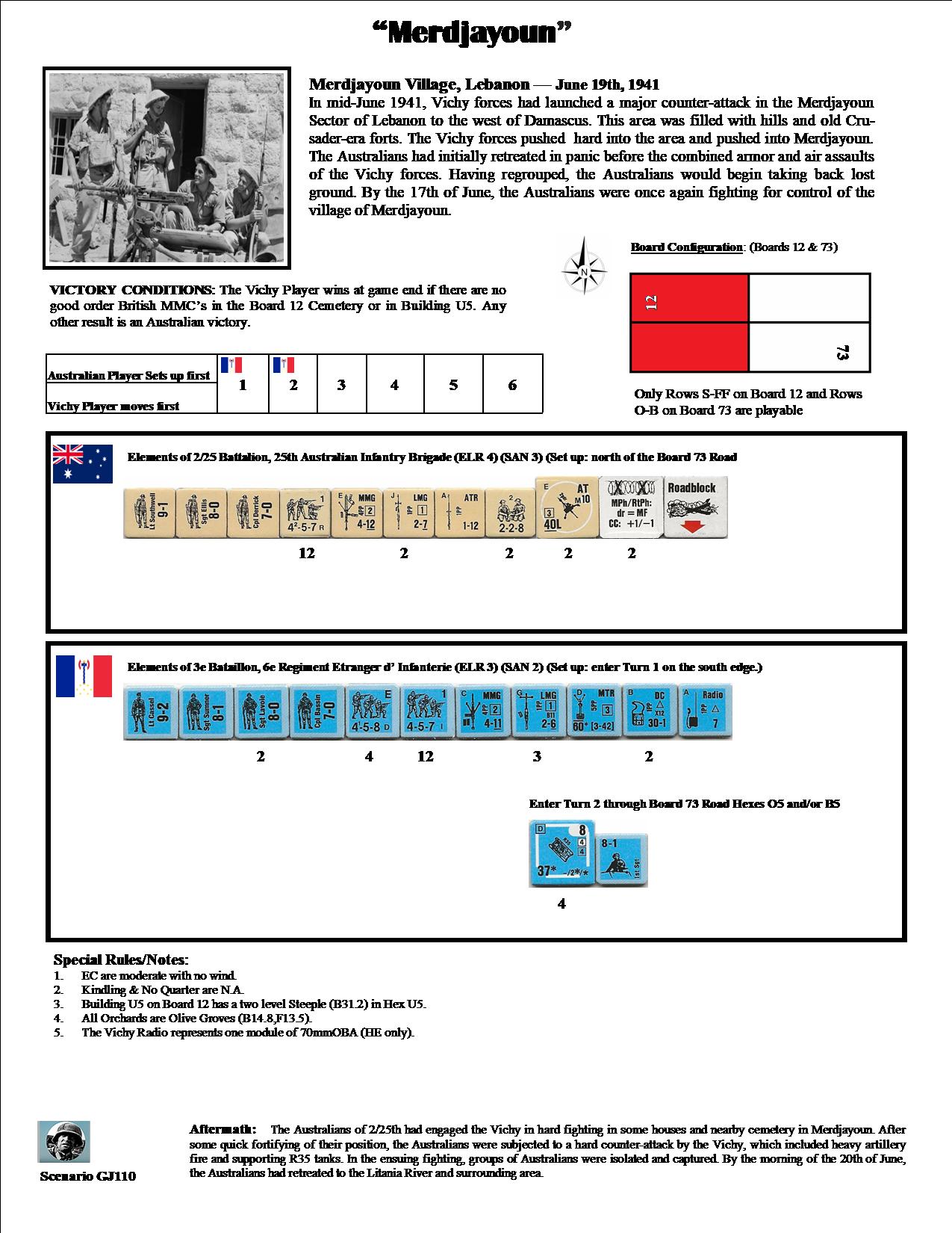 In mid-June 1941, Vichy forces had launched a major counterattack in the Merdjayoun sector of Lebanon to the west of Damascus. This area was filled with hills and old Crusader era forts. The Vichy forces pushed hard into the area and pushed into Merdjayoun. The Australians had initially retreated in panic before the combined armor and air assaults of the Vichy forces. Having regrouped, the Australians would begin taking back lost ground. By the 17th of June, the Australians were once again fighting for control of the village of Merdjayoun.Attacker: Vichy French (3e Bataillon, 6e Regiment Etranger d’ Infanterie)