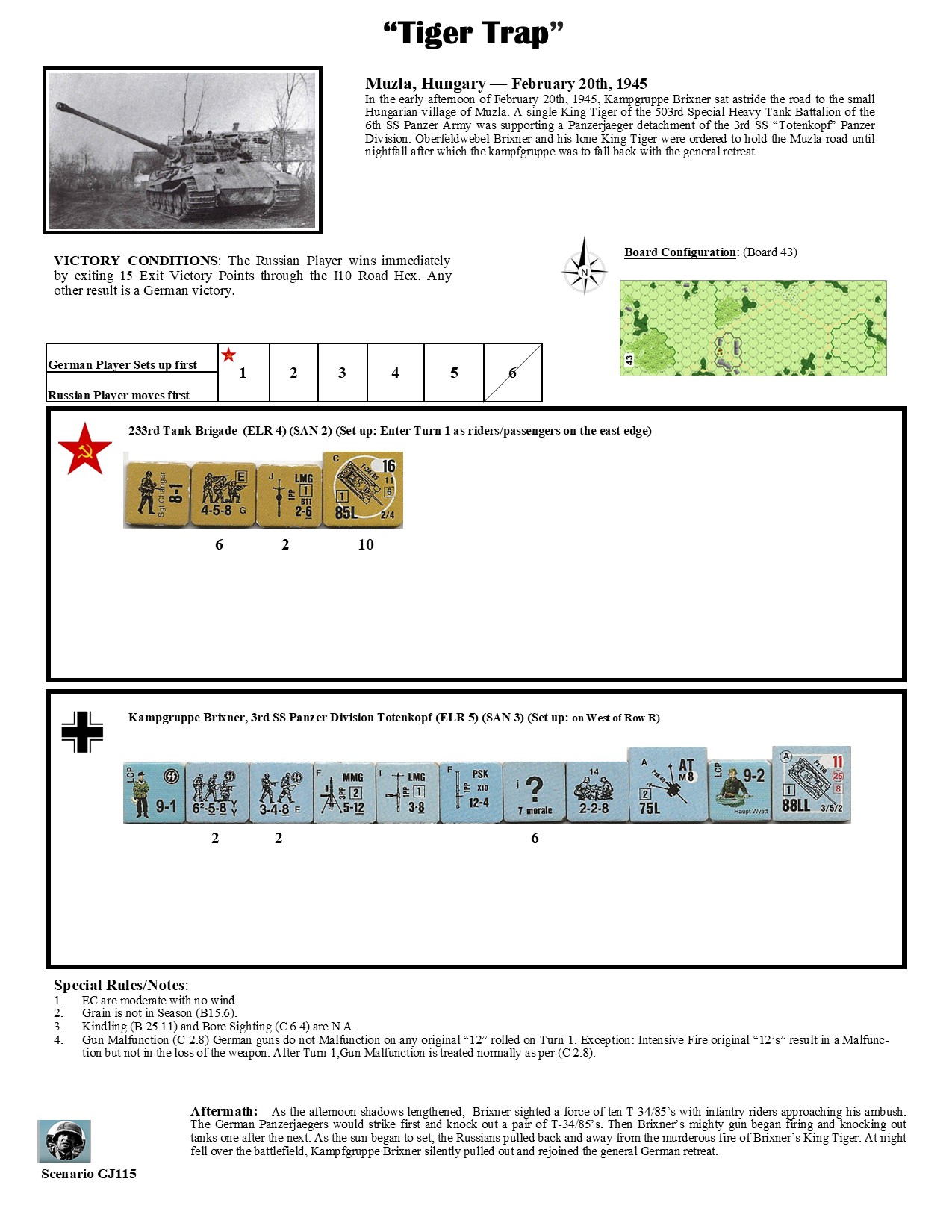 In the afternoon of February 20th, 1945, Kampfgruppe Brixner sat astride the road to the small Hungarian village of Muzla. A single King Tiger of the 503rd Heavy Special Tank Battalion of the 6th SS Panzer Army was supporting a Panzerjäger detachment of the 3rd SS "Tokenkopf" Panzer Division. Oberfeldwebel Brixner and his lone King Tiger were ordered to hold the Muzla road until nightfall after which the Kampfgruppe was to fall back in a general retreat.Attacker: Russian (233rd Tank Brigade)