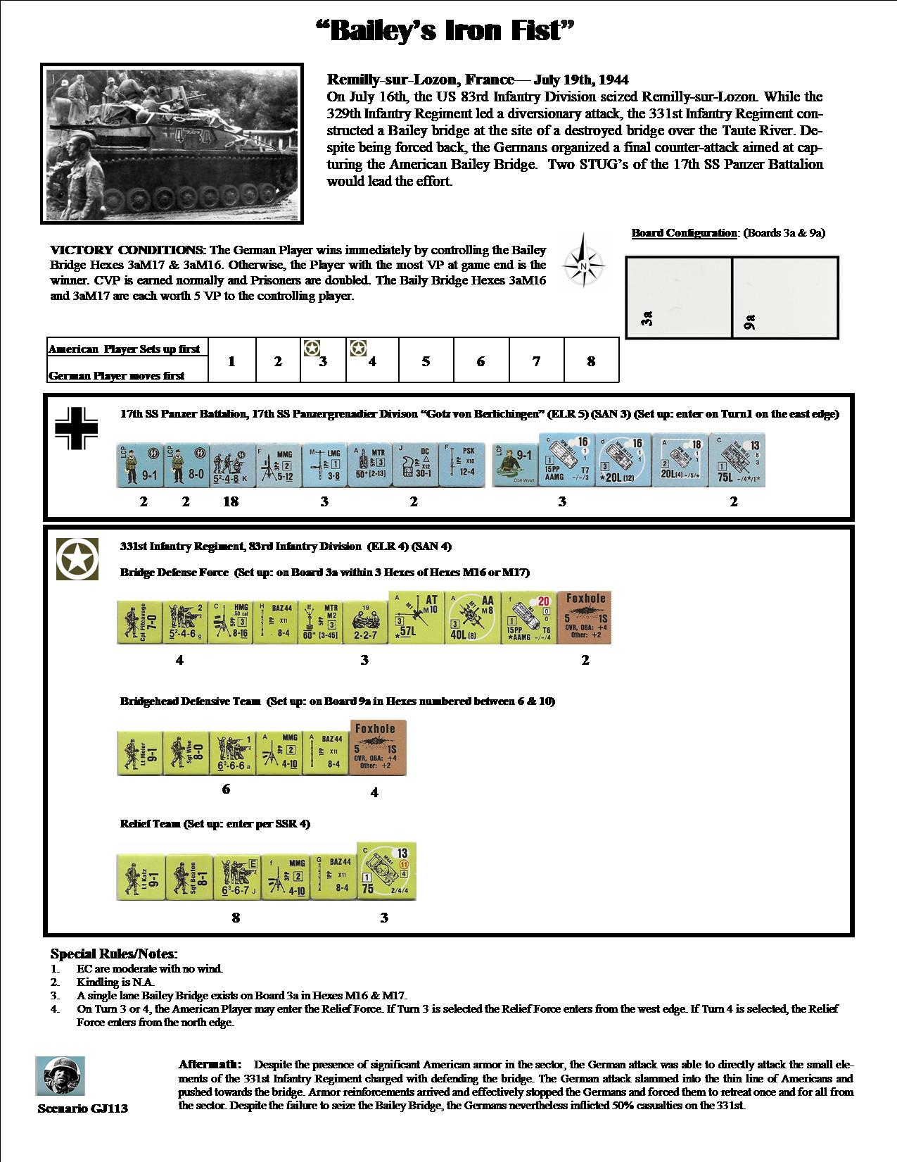 2023-07-02(A) Kermit Mullins vs Dan Best American winMy SS went along the South edge and cleared the Americans, but took too much time. Dan chose Turn 4 to bring in his reinforcements from the north. I bum rushed the Bridge to try and get the immediate Win. One STUG made it on to the bridge, but the second ESB's and was immobilized next to the Bridge. The Americans counter-attacked and concentrated on the bridge area and that was game as the Germans had no more AFV's. Fun game!