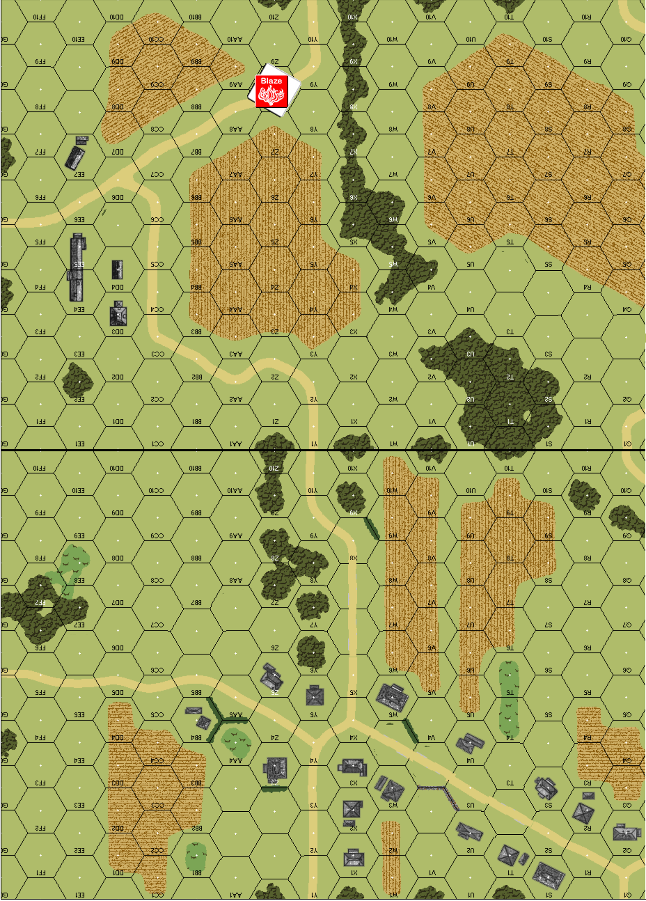 | Misc Rules: | Bldgs: Stone. Orchards: Open ground, Orchards in road hexes do not exist. |