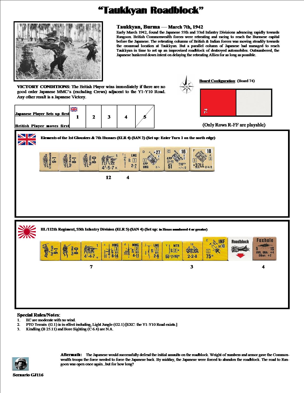 Early March 1942, found the Japanese 55th and 33rd Infantry Divisions advancing rapidly towards Rangoon. British Commonwealth forces were retreating and racing to reach the Burmese capital before the Japanese. The retreating columns of British and Indian Forces were moving rapidly towards the crossroads at Taukkyan. But a parallel column of Japanese had managed to reach Taukkyan in time to set up an improvised roadblock of destroyed automobiles. Outnumbered, the Japanese hunkered down intent on delaying the retreating Allies for as long as possible.Attacker: Commonwealth (1st Gloucesters & 7th Hussars)