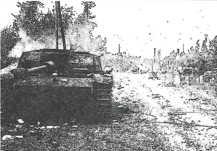 German troops of the 7. Armee Sturm-Bataillon had pushed down the west side of the main road into Sainte-Mère-Église to within 50 yards of the 82nd Airborne's aid station in a building on the outskirts of the town. A large group of infantrymen with an accompanying self-propelled vehicle had broken through by firing smoke and then darting from hedgerow to hedgerow.Attacker: German (Sturm-Bataillon AOK 7, 7. Armee)