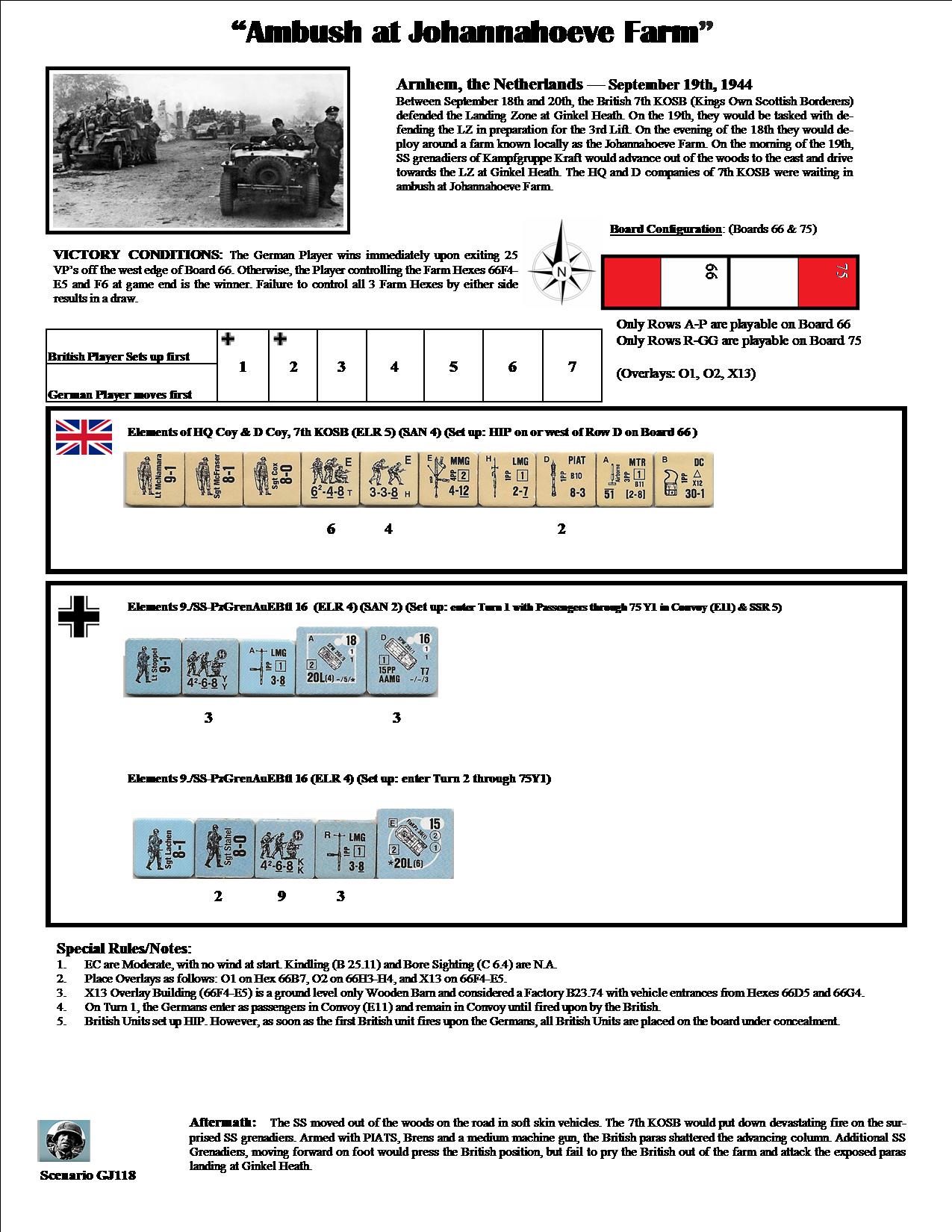 Between September 18th and 20th, the British 7th KOSB (King's Own Scottish Borderers) defended the Landing Zone at Ginkel Heath. On the 19th, they would be tasked with defending the LZ in preparation for the 3rd Lift. On the evening of the 18th they would deploy around a farm known locally as the Johannahoeve Farm. On the morning of the 19th, SS grenadiers of Kampfgruppe Kraft would advance out of the woods to the east and drive towards the LZ at Ginkel Heath. The HQ and D Companies of the 7th KOSB were waiting in ambush at Johannahoeve Farm.Attacker: German (SS) (9./SS-PzGrenAuEBtl 16)