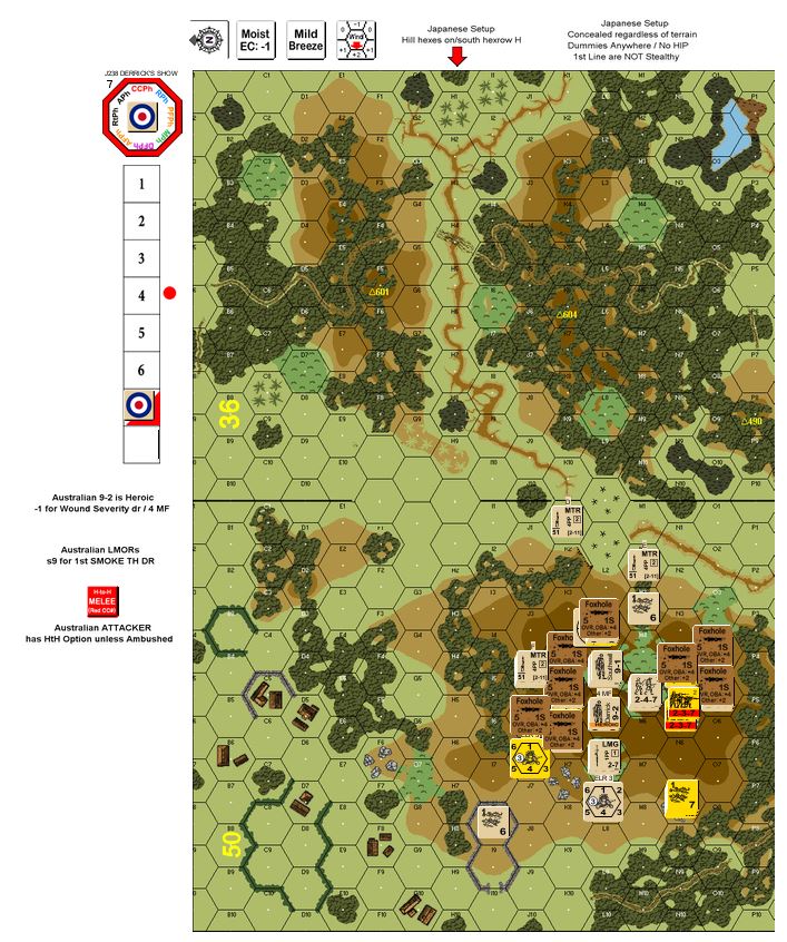 On 22 September, Australian forces landed at beaches around Finschhafen, located on the north coast of central Papua New Guinea. Spreading out from the bridgehead, the Australian 9th Division occupied numerous strategic outposts in the hilly hinterland. The Japanese 20th Division tried to dislodge the Australians, but by late October they were largely on the defensive. Moving onto the offensive, akey objective of the Australians was the capture of Sattelberg, six kilometers from the coast. Two battalions would approach the village from the south along a main track that crossed Coconut Ridge. Fortunately, this track was sufficiently hard to take the weight of Australian tanks. These tanks proved crucial in reducing several key Japanese defensive points in the hilly terrain. However, in the final ridges that guarded Sattelberg, the tanks could no longer operate. Subsequent pushes combined infantry, artillery, and air support but the Japanese continued to prove resilient. A final effort by Sergeant Tom "Diver: Derrick, now in charge of his platoon, changed the momentum.Attacker: Australian (Company B, 2./48th Battalion, 9th Division)